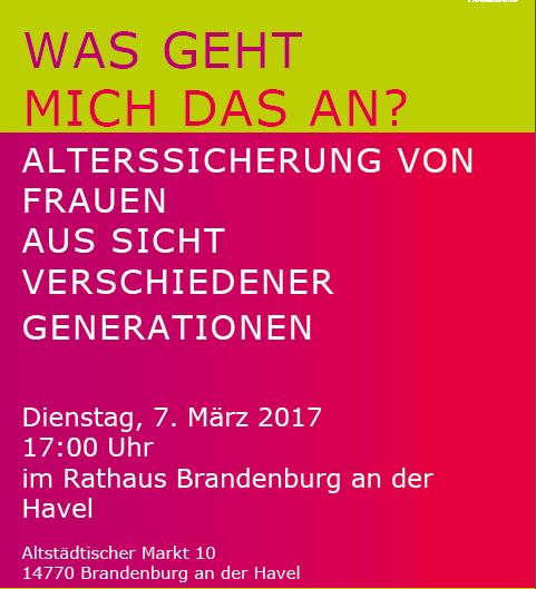 Im Rahmen der Brandenburgischen Frauenwoche wird zu einem interessanten Podiumsgespräch „Was geht mich das an? Alterssicherung von Frauen aus Sicht verschiedener Generationen“ am Dienstag, dem 7. März 2017 um 17:00 Uhr in das Altstädtische Rathaus, Altstädtischer Markt 10, eingeladen.