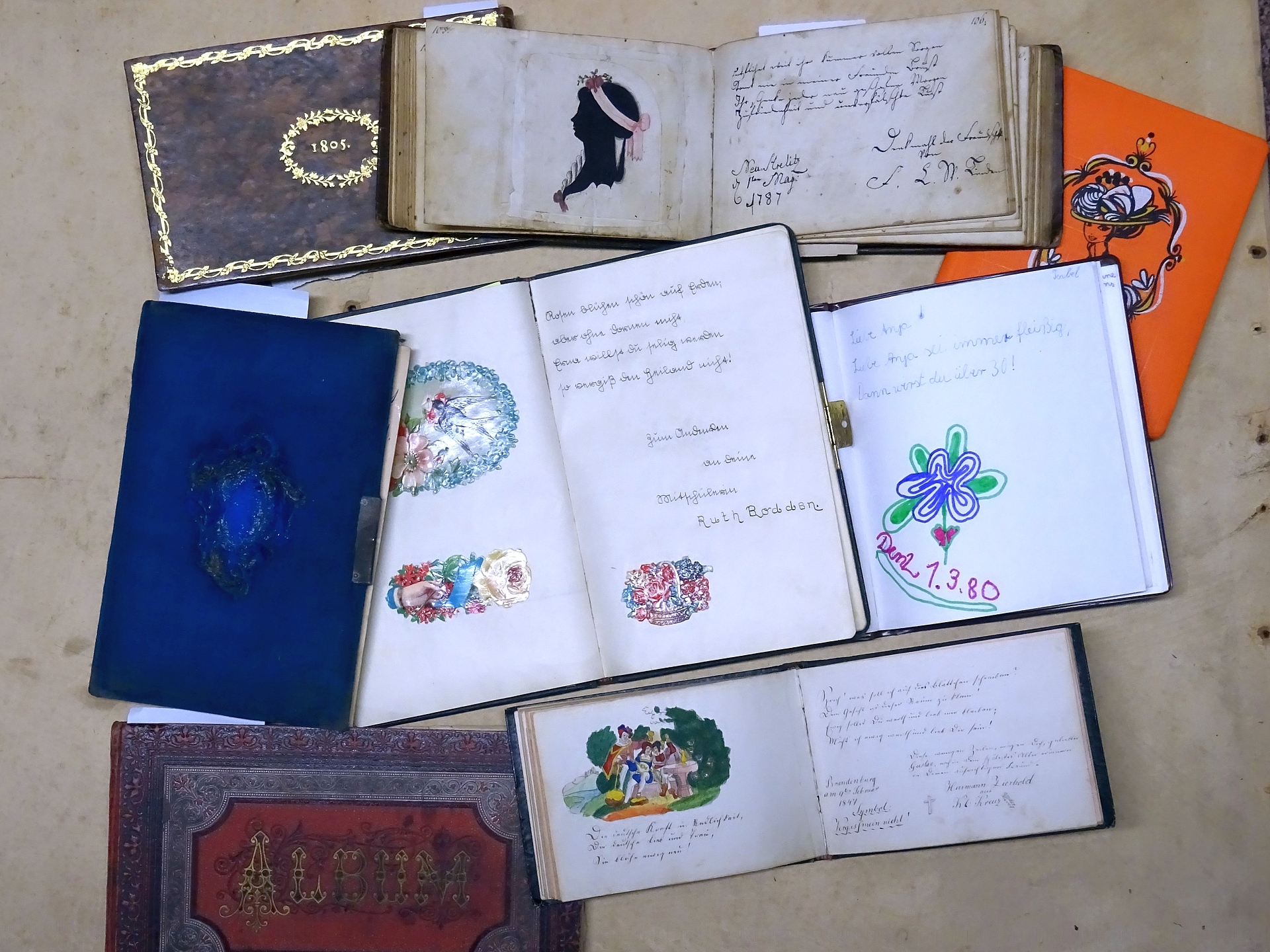 Das Museumsteam hat bereits im Depot danach gesucht, hat die eigenen Alben von zuhause mitgebracht und darin gestöbert. Wie viele Erinnerungen stecken darin! Und auch die Eintragungen in den Museumsstücken rühren an!