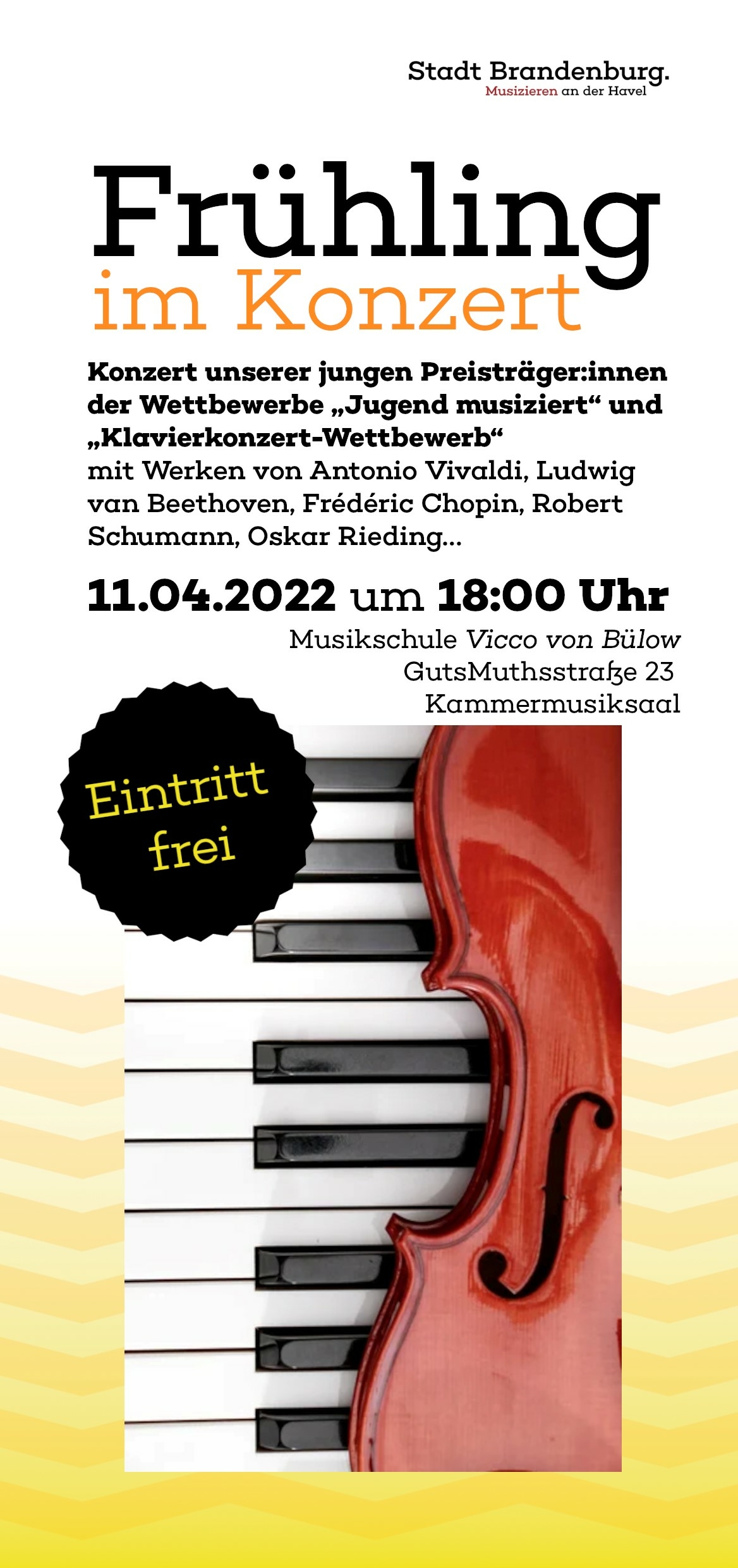 Die Preisträgerinnen und Preisträger dieser beiden Wettbewerbe freuen sich gemeinsam mit ihren Lehrerinnen, Ihnen Ausschnitte aus ihren Wettbewerbsprogrammen präsentieren zu dürfen und laden Sie herzlich zum Konzert im Frühling am 11.04.2021 um 18:00 Uhr in den Kammermusiksaal der Musikschule Vicco von Bülow in die GutsMuthsstraße 23 in Brandenburg an der Havel ein.