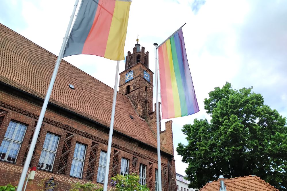 Anlässlich der bundesweiten Aktion „Regenbogenband über Deutschland“ zum Internationalen Tag gegen Homo-, Bi-, Inter* und Transfeindlichkeit hat Oberbürgermeister Steffen Scheller gemeinsam mit Christopher Schreiber, Geschäftsführer des Landesverbandes Berlin-Brandenburg e.V. des Lesben- und Schwulenverbandes, die Regenbogenfahne an der Stirnseite des Altstädtischen Marktes, am Altstädtischen Rathaus, gehisst.