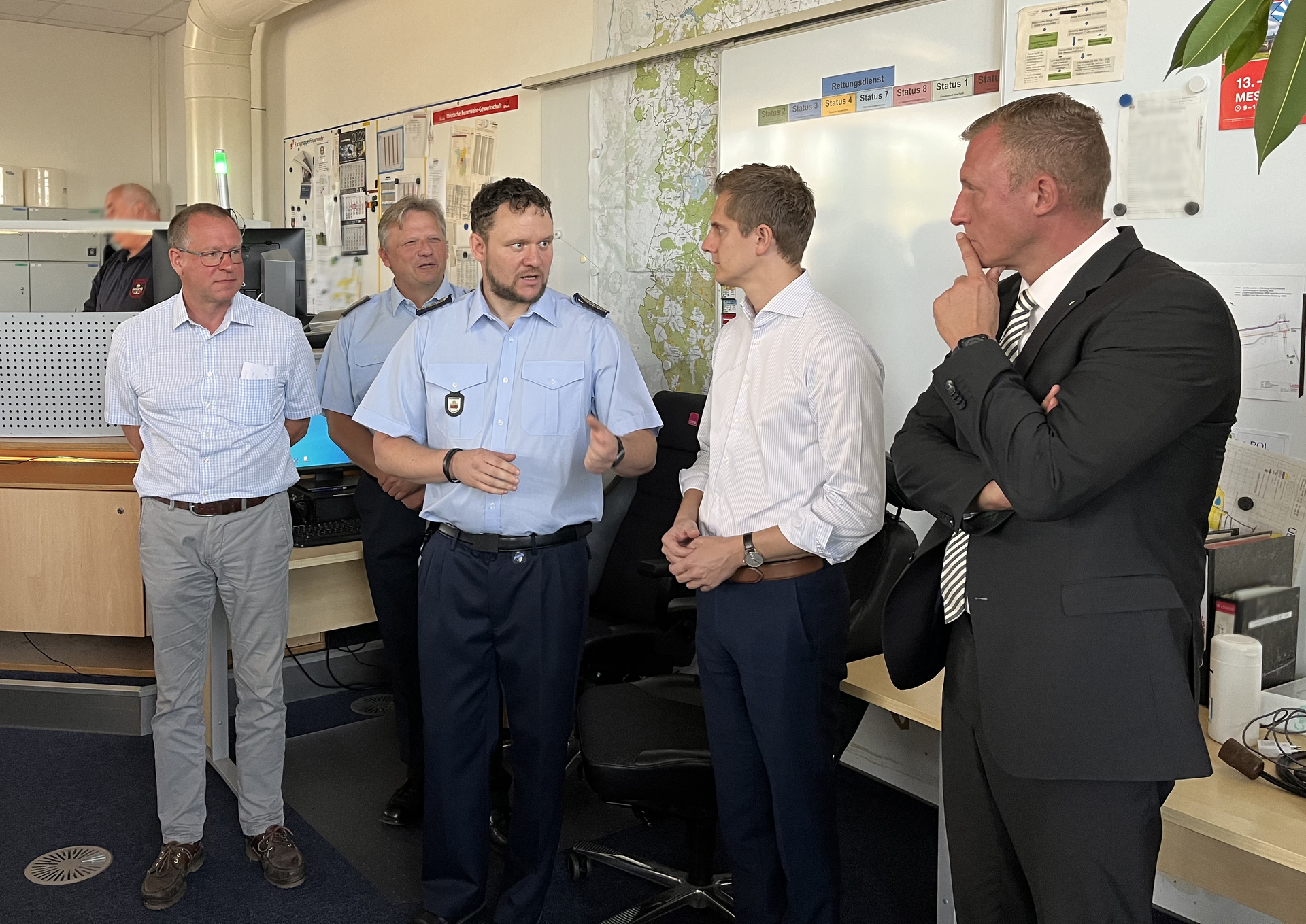 Staatssekretär Dr. Benjamin Grimm, Digitalbeauftragter der Landesregierung, besuchte am Donnerstag, dem 11. August 2022, die Regionalleitstelle in Brandenburg an der Havel, um sich über digitale Systeme zur Unterstützung der Ersthilfe in Notsituationen zu informieren. Empfangen wurde er von Thomas Barz, Beigeordneter zuständig u.a. für die Feuerwehr und das Rettungswesen, Martin Hochstatter, Ärztlicher Leiter Rettungsdienst der Stadt Brandenburg an der Havel, Hendrik Hänig – 1. Vertreter des Leiters der Regionalleitstelle, und weiteren Kollegen der Feuerwehr.