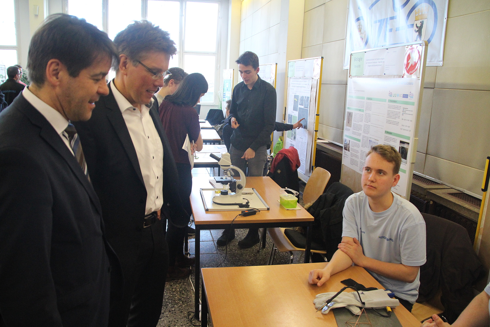Vor der Preisvergabe besichtigte Oberbürgermeister Steffen Scheller die Stände der Jungforscher und Schüler und ließ sich die Projekte erklären. „Es fasziniert mich, mit wie viel Ehrgeiz, Spaß und Engagement die Jugendlichen ihre Projekte vorstellen“, sagte er während der Besichtigung.
