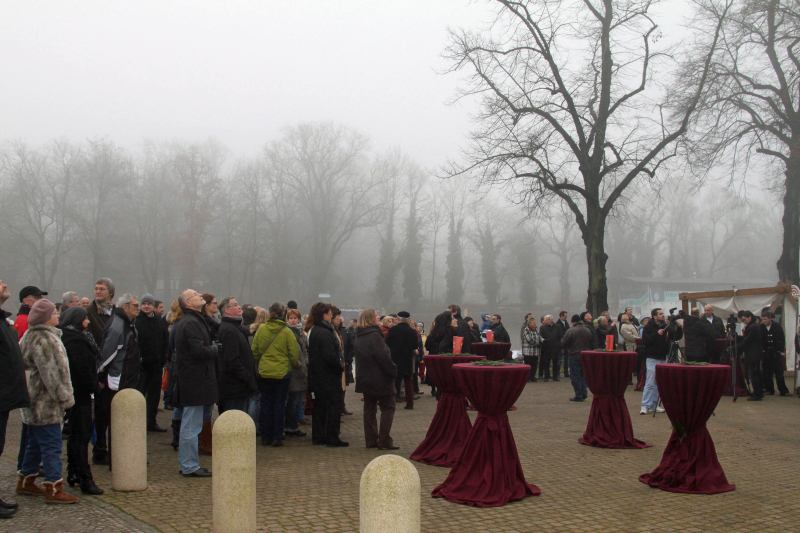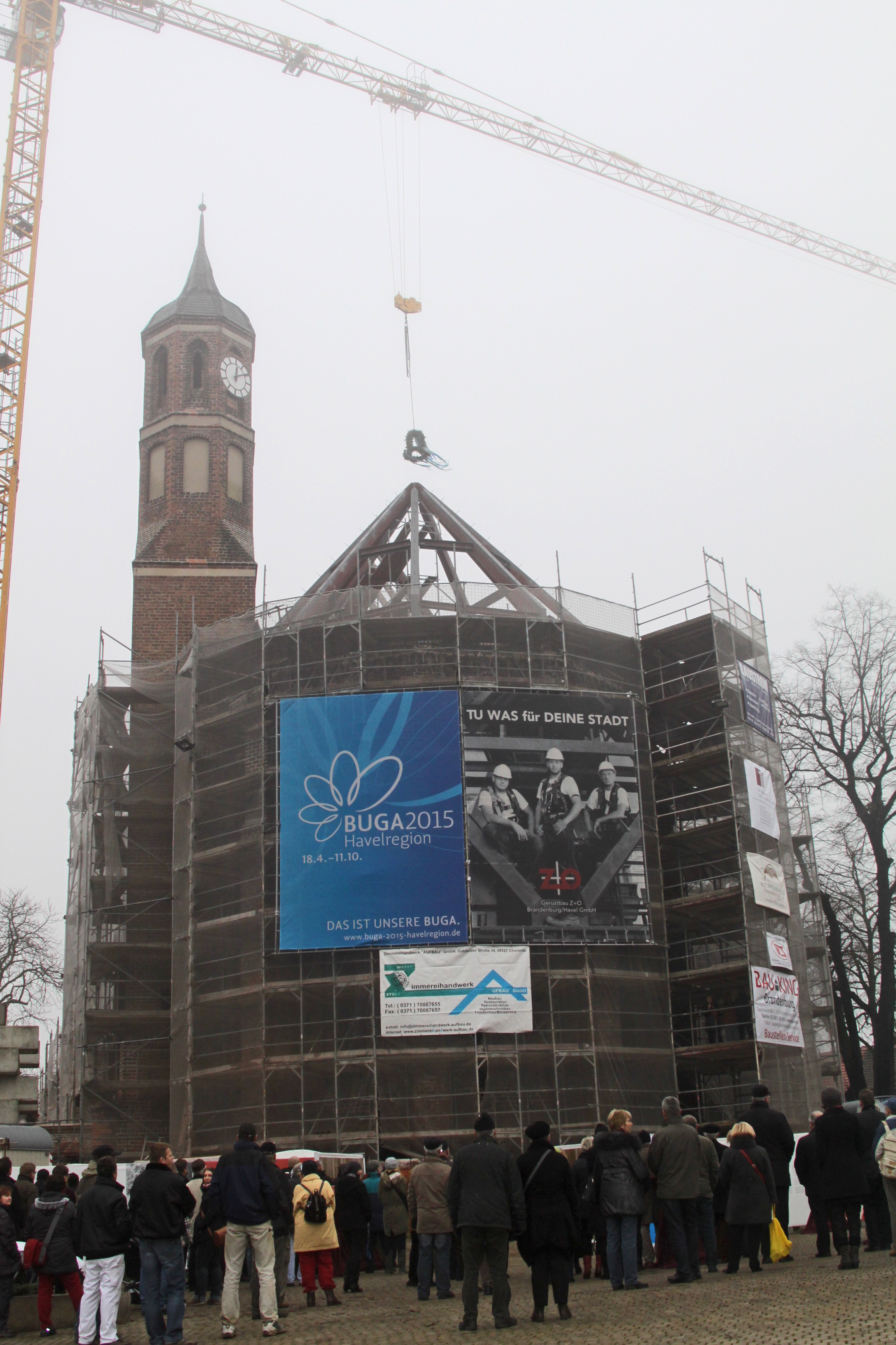 Gemeinsam mit den Architekten, Planern und Bauleuten sowie zahlreichen Gästen haben Oberbürgermeisterin Dr. Dietlind Tiemann und Stefan Freitag, Presbyter der Ev.-ref. Kirchengemeinde Brandenburg an der Havel, am Donnerstag, 12.12.2013, Richtfest für die St. Johanniskirche am Salzhofufer gefeiert. Die historische Kirche wird seit 2012 umfangreich saniert und soll zur Bundesgartenschau 2015 mit einer Hallenschau in Szene gesetzt werden.