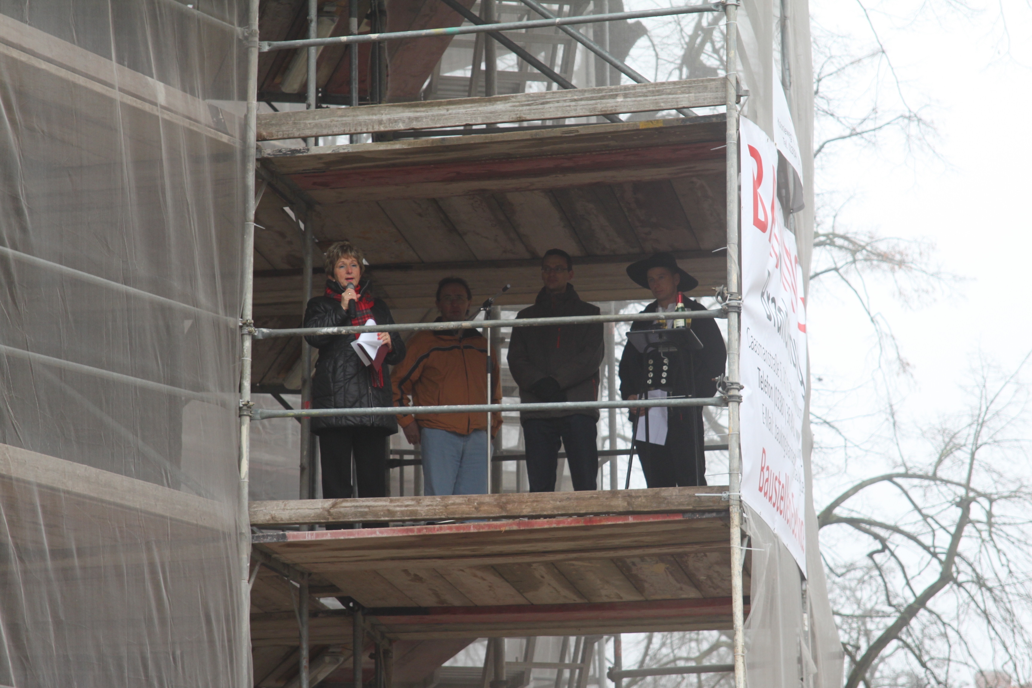 In ihrem Grußwort hob die Oberbürgermeisterin die Bedeutung dieses wichtigen städtebaulichen Projektes hervor: „Die Entscheidung für die BUGA 2015 und die Idee, die St. Johanniskirche für die Blumenschau zu nutzen, eröffnete früher als erhofft, die Chance zur weitergehenden Sanierung, die 2011 geplant und 2012 begonnen wurde.“ Weiter sagte sie: „Es ist schön zu sehen, wie die St. Johanniskirche mit der Montierung des neuen Dachs ihre städtebauliche Bedeutung zurück erlangt.“ Abschließend dankte Dietlind Tiemann allen, die an diesem großen Vorhaben mitwirken.