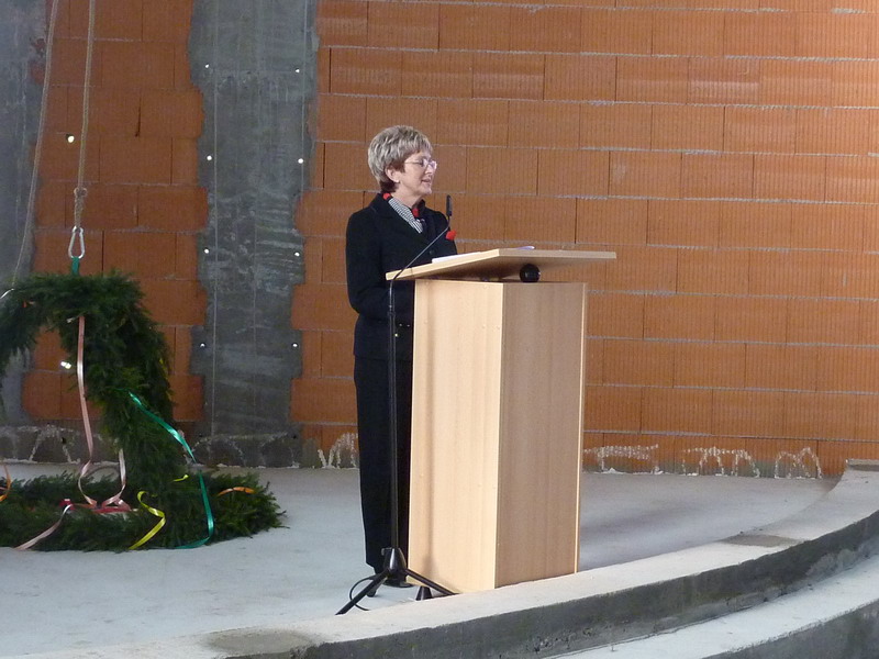 Bereits bei der Grundsteinlegung vor etwas mehr als 70 Tagen hatte Dr. Dietlind Tiemann darauf hingewiesen, dass sie zu den wenigen Oberbürgermeistern zählt, in deren Amtszeit ein neues Gotteshaus und Gemeindezentrum errichtet wird. Mit dem Aufziehen der Richtkrone wurde die wichtige Rohbauphase abgeschlossen und der Startschuss für die nun folgenden Bauabschnitte gegeben.