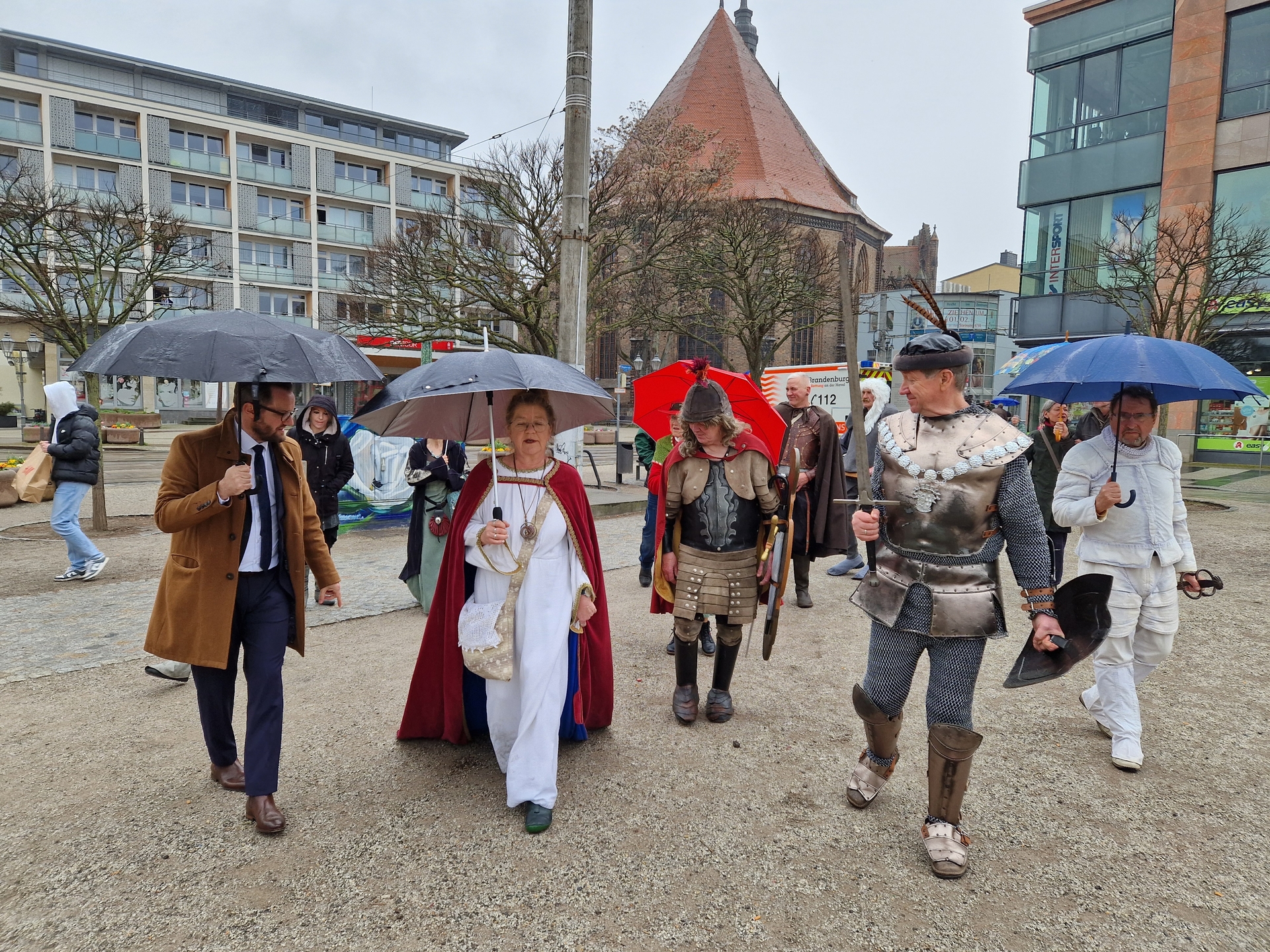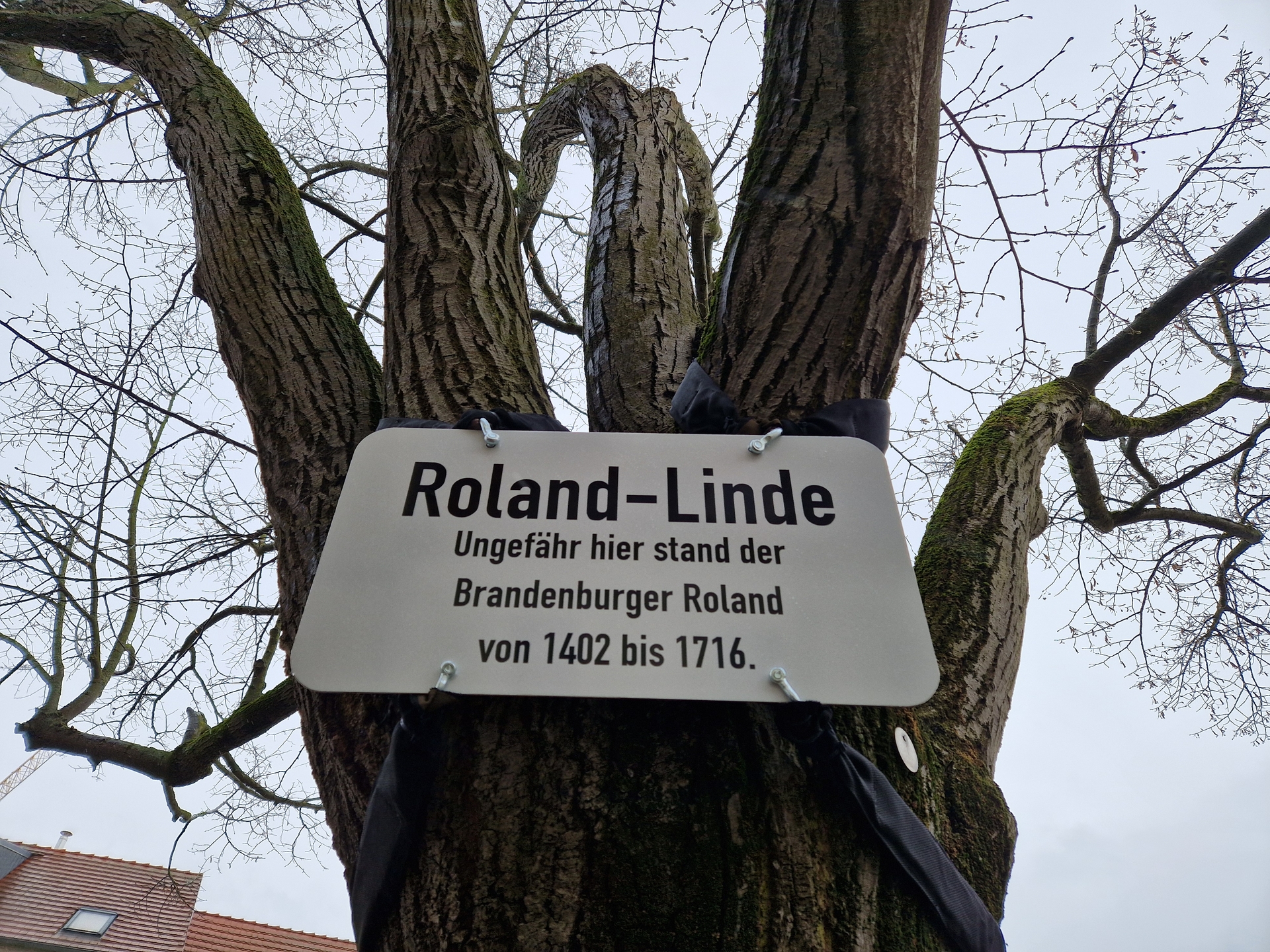schildert er. Seine Ausstattung mit Plattenrüstung, Dolch und Schwert folgt, zum Auftakt genügte eine mittelalterliche Stoffgewandung. So zogen sie zu acht und mit Gefolge sowie samt Stadtrepräsentant Michael Müller (Bürgermeister) von der Alt zur Neustadt, und zwar zum Originalstandort des Rolands nahe heutiger Commerzbank. Dort 1474 aufgestellt, stand er den Soldaten später beim Exerzieren im Weg, weswegen er mit Genehmigung des Soldatenkönigs Friedrich Wilhelm I. 1716 vor das Neustädtische Rathaus gesetzt wurde. Man machte sich die damals vollzogene Vereinigung von Alt- und Neustadt zunutze, die mit der Festlegung des Neustädtischen Rathauses als Verwaltungssitz einherging. 1941 wurde der Roland von klugen Brandenburgern zum Schutz vor Bombenangriffen demontiert und auf dem Gut Wendgräben gut versteckt. 1946 fand er seinen neuen Platz vor dem Altstädtischen Rathaus, wo er nun friedlich Geburtstag feiern kann. Die leibhaftigen Rolande taten es ganztägig, weihten an der ursprünglichen Rolandstelle die „Rolandlinde“, schenkten auf dem Rückweg dem verblassten Roland-Abbild am Eckhaus in der Haupt- und Grabenstraße Aufmerksamkeit. Unterwegs spendierte ihnen Bürgermeister Müller einen heißen Kaffee, bevor es zum großen Gruppenbild vor dem Rathaus am Roland ging. Den Abschluss bildete ein Vortrag in der ehemaligen Ritterakademie des Domes. Auf Einladung des Historischen Vereins stellte Rechtshistoriker Frank Riedel die anwesenden Rolande und ihre Bedeutung für die jeweiligen Städte vor, sprach über Brandenburger Gerichtsbarkeiten einschließlich Schöppenstuhl.