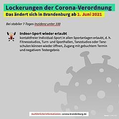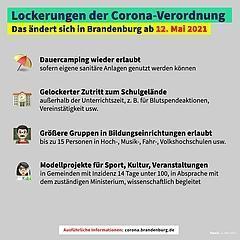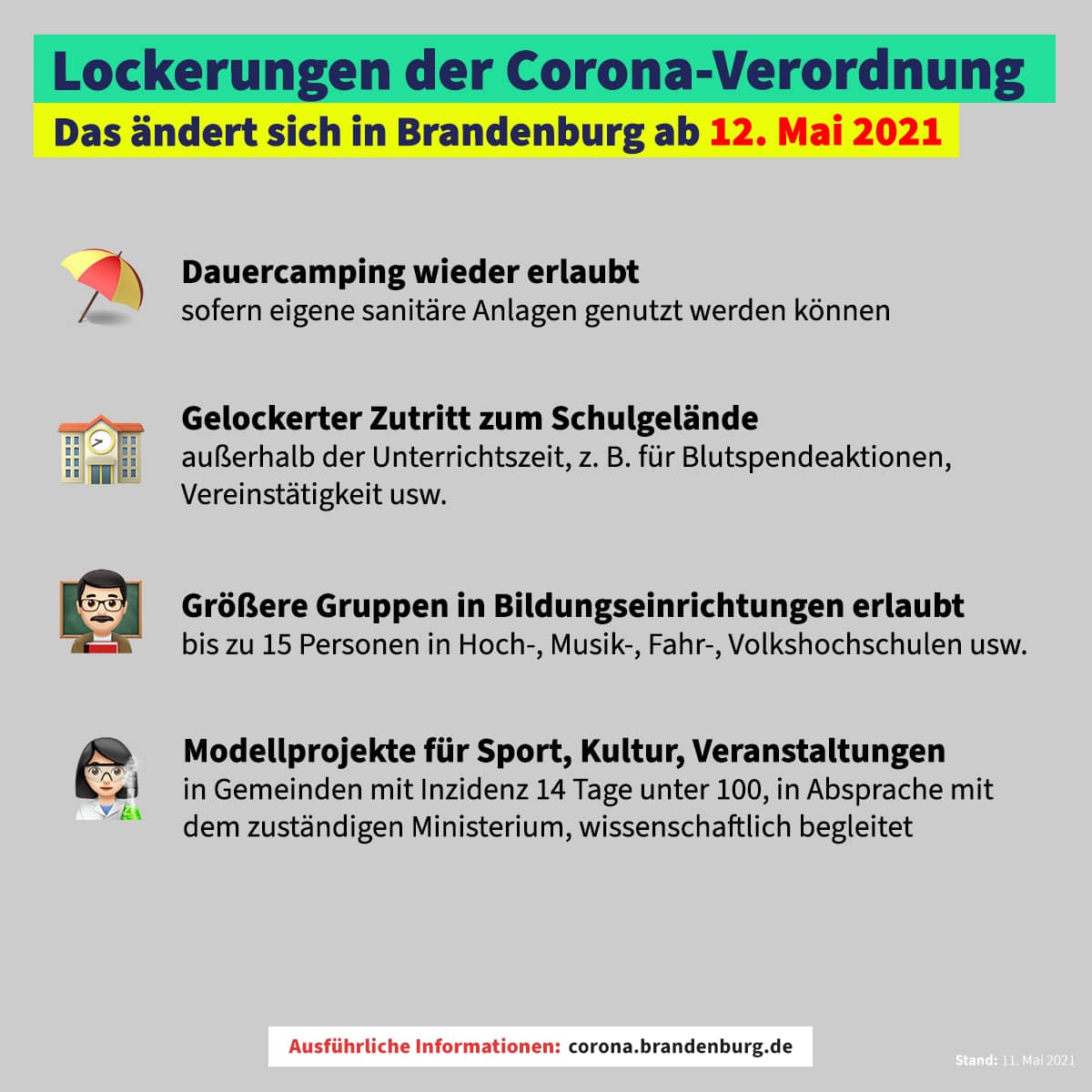Sinkende Infektionszahlen, mehr Geimpfte, mehr Testmöglichkeiten: Vor diesem Hintergrund hat das Brandenburger Kabinett heute Änderungen der Corona-Verordnung beschlossen. Erste Erleichterungen treten bereits am morgigen 12. Mai in Kraft: So ist zum Beispiel in Landkreisen und kreisfreien Städten mit einer stabilen 7-Tage-Inzidenz unter 100 das Dauercamping in Brandenburg wieder erlaubt und es gibt eine Vereinfachung bei der Testpflicht. Vom 21. Mai an (Freitag vor Pfingsten) sind unter Auflagen Außengastronomie, Kulturveranstaltungen unter freiem Himmel, touristische Übernachtungen in autarken Unterkünften, touristische Angebote wie Schiffsausflüge sowie kontaktfreier Individualsport auf Sportanlagen unter freiem Himmel ohne Personenbegrenzung erlaubt. Vom 1. Juni an ist wieder Indoor-Sport möglich. Die geänderte 7. SARS-CoV-2-Eindämmungsverordnung tritt morgen in Kraft. Sie gilt vorerst bis einschließlich 9. Juni.