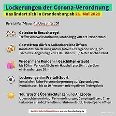 Pressemitteilung der Staatskanzlei Brandenburg: Kabinett beschließt schrittweise Lockerung der Corona-Regeln: Außengastronomie, touristische Übernachtungen und Open-Air-Kultur bei stabiler Inzidenz unter 100 ab 21. Mai möglich