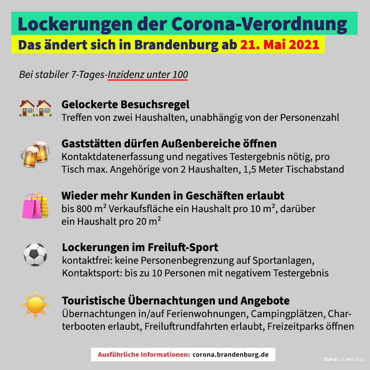 Das wichtigste Datum in der Verordnung ist der 21. Mai, der Freitag vor dem Pfingstwochenende. Dann treten die entscheidenden Lockerungen in allen Landkreisen und kreisfreien Städten mit einer stabilen 7-Tage-Inzidenz unter 100 in Kraft. Nach heutigem Stand würden die Lockerungen in 7 Landkreisen und – ab morgen – mit Brandenburg an der Havel einer kreisfreien Stadt greifen.