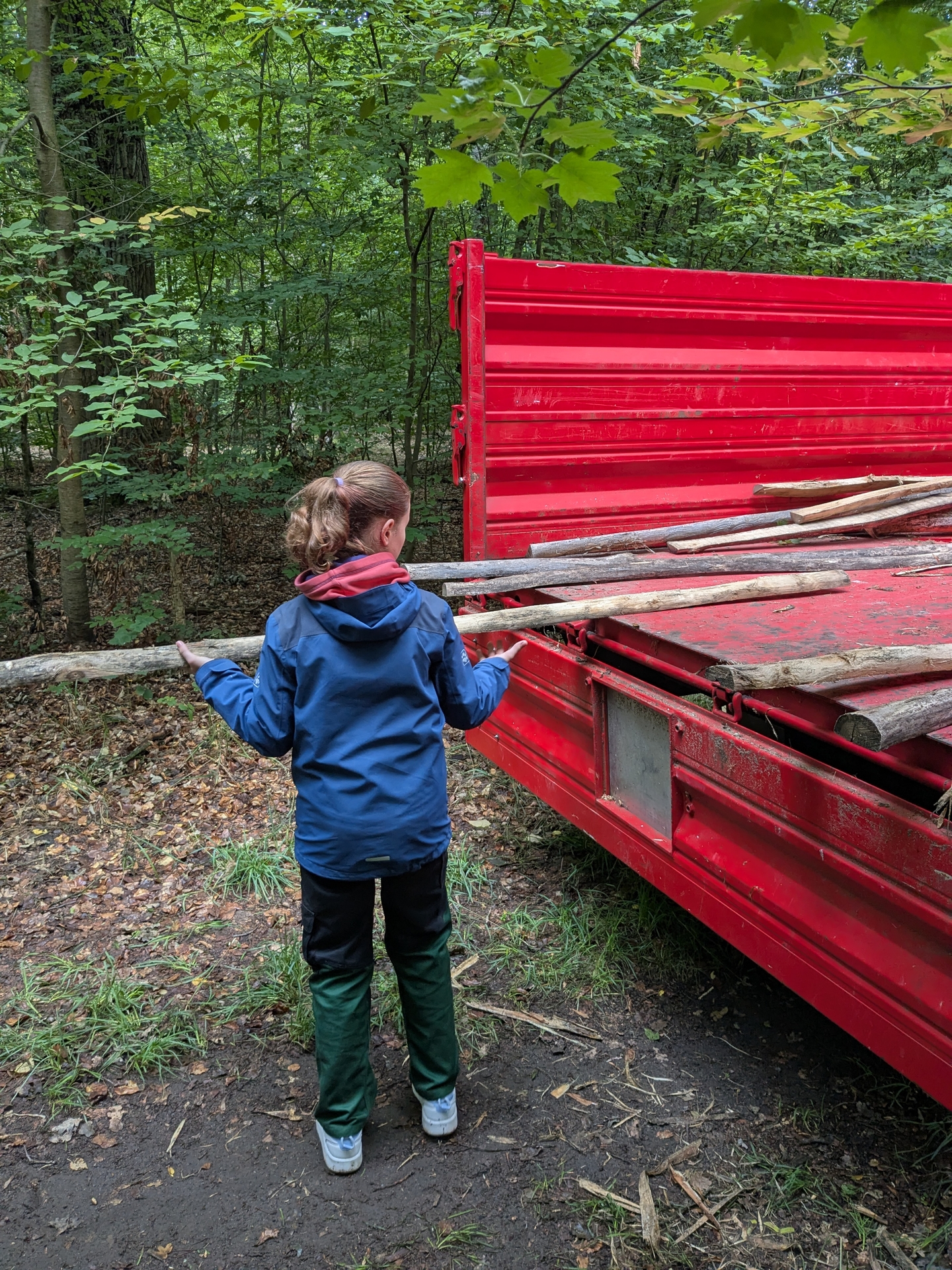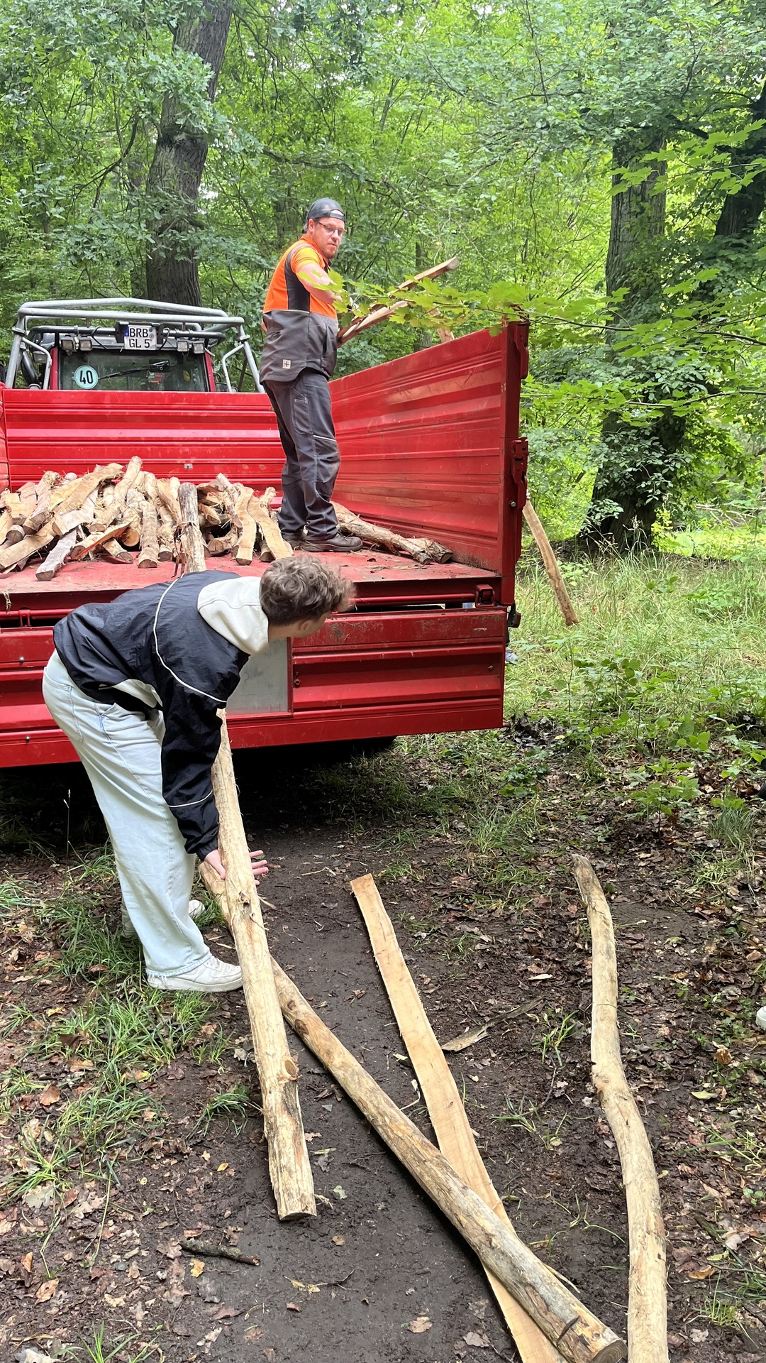 Die Schülerinnen und Schüler machten sich an die Arbeit und brachten zuerst das neue Holz für den Zaun, 40 Pfosten und 80 Querhölzer, an Ort und Stelle. Schließlich waren 100 Meter Holzzaun zu errichten.