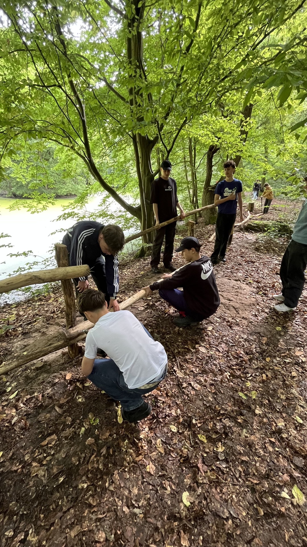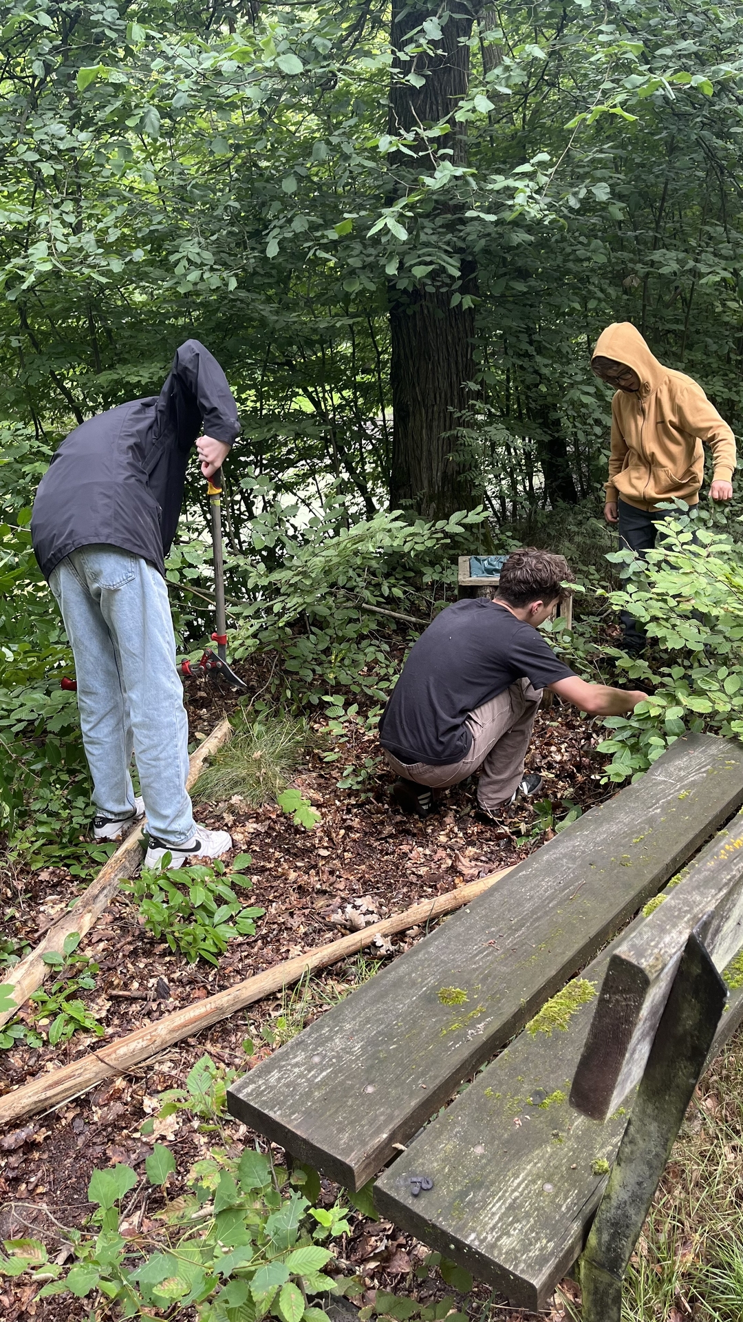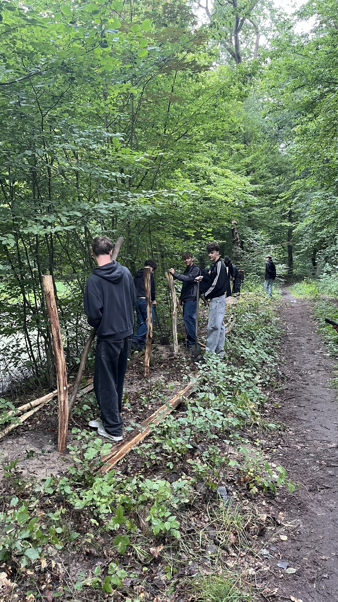 Insgesamt 16 Schülerinnen und Schüler der 7. bis 9. Jahrgangsstufe trafen sich am 17. und 18. Juli 2025 dabei im Krugpark, um zwei Tage im Wald zu verbringen. Es galt für Sicherheit zu sorgen, denn das Geländer am sogenannten „Verlobungsteich“ war in die Jahre gekommen und sollte nun erneuert werden.