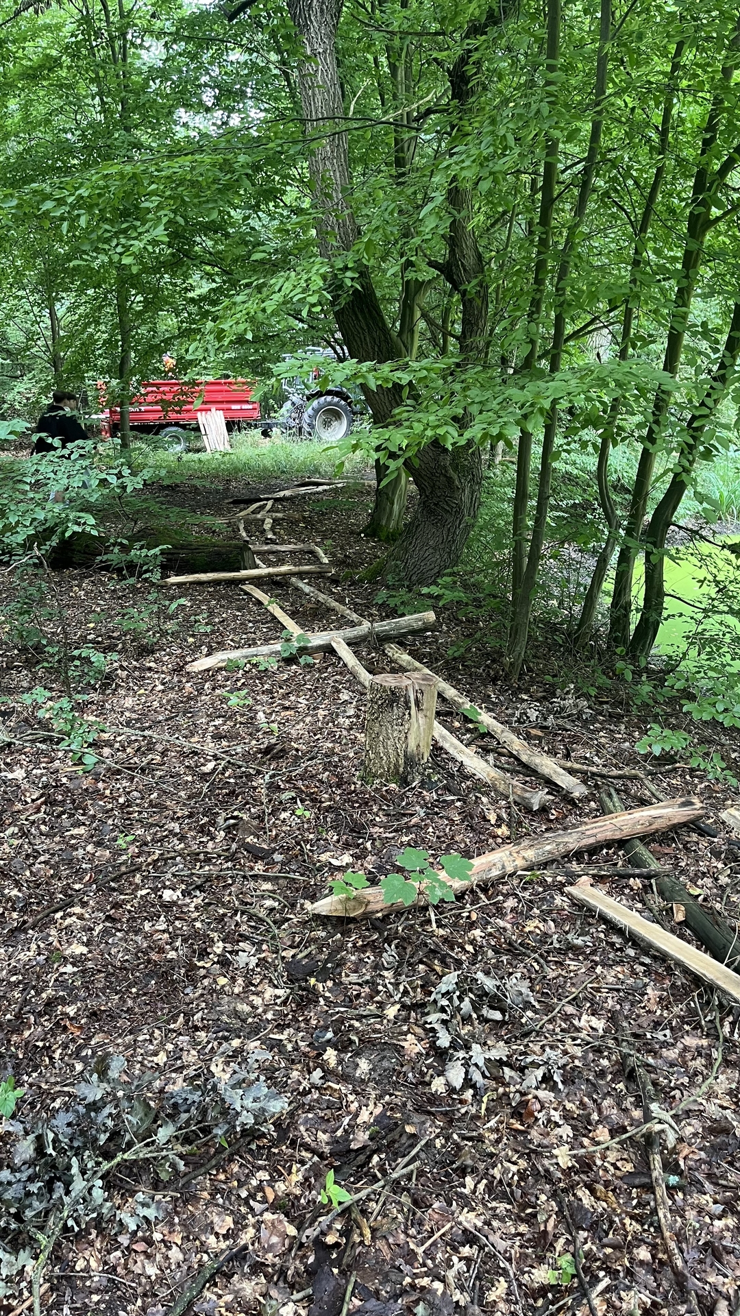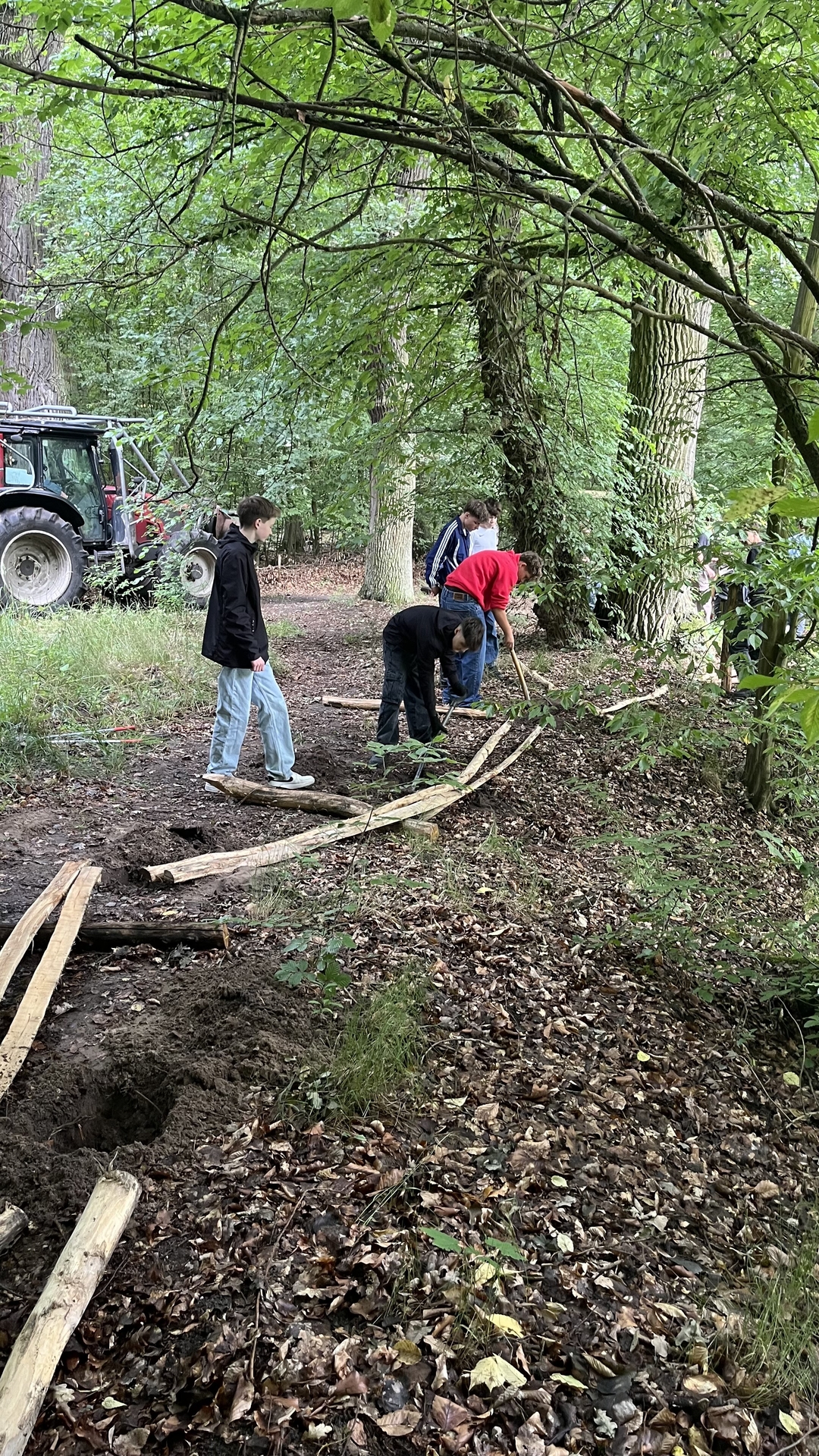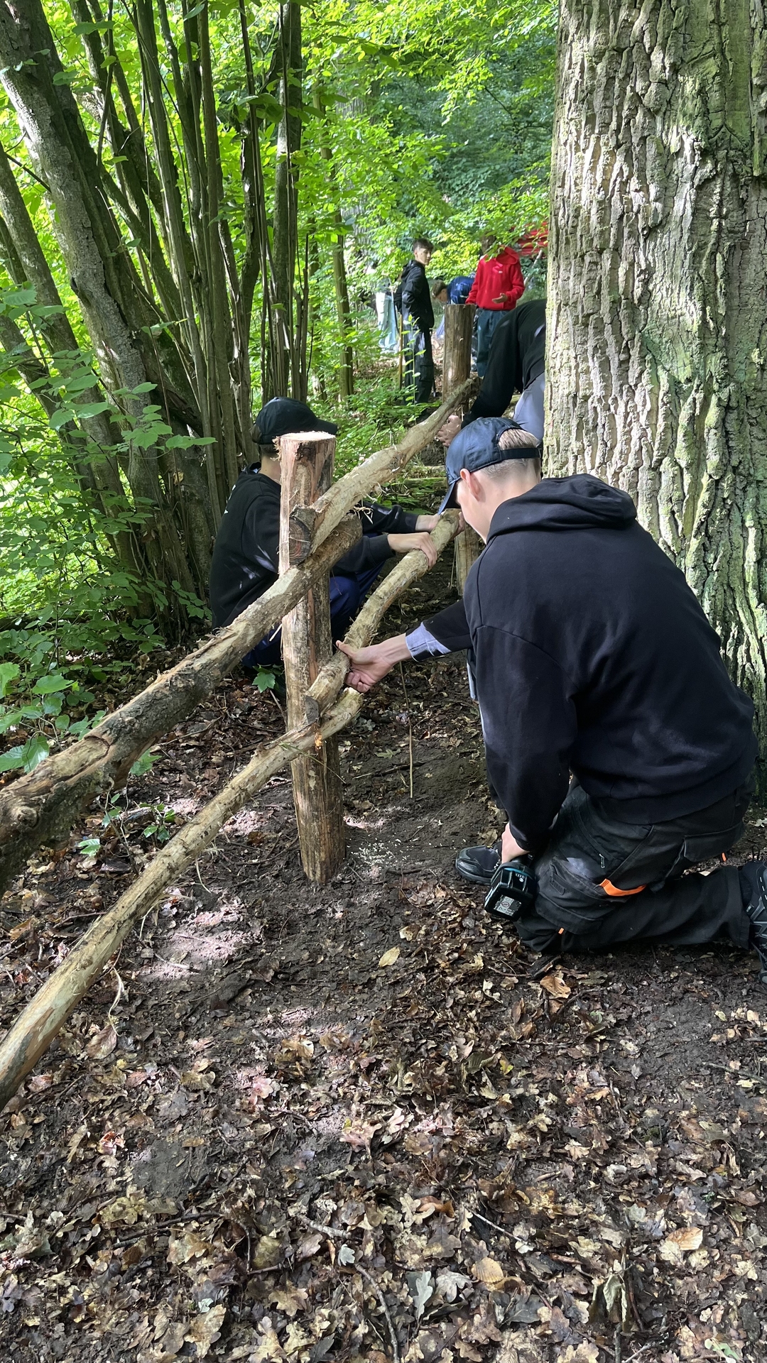 Insgesamt 16 Schülerinnen und Schüler der 7. bis 9. Jahrgangsstufe trafen sich am 17. und 18. Juli 2025 dabei im Krugpark, um zwei Tage im Wald zu verbringen. Es galt für Sicherheit zu sorgen, denn das Geländer am sogenannten „Verlobungsteich“ war in die Jahre gekommen und sollte nun erneuert werden.