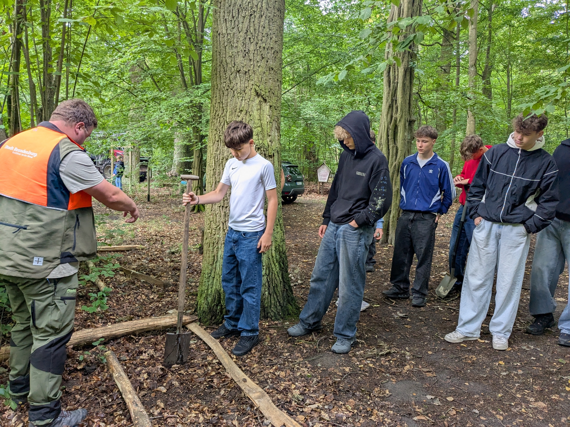 Anschließend wurden die Löcher, mindestens einen halben Meter tief, für die Zaunpfosten gegraben. Im verwurzelten und festen Waldboden war das gar nicht so einfach und verlangte einiges an Anstrengung. Die städtischen Waldarbeiter, Herr Dechow und Herr Huxdorf, gaben jedoch wertvolle Tipps, so dass dann einiges doch etwas leichter von der Hand ging.