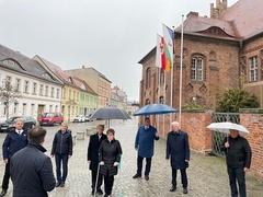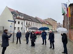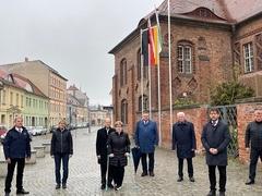 Oberbürgermeister Steffen Scheller hat heute gemeinsam mit dem SVV-Vorsitzenden Walter Paaschen sowie den Fraktionsvorsitzenden um 11:00 Uhr eine Gedenkminute am Flaggenstand des Altstädtischen Rathauses abgehalten, um den vielen Personen, die an oder mit COVID-19 verstorben sind, zu gedenken. Ebenfalls anwesend war die Bundestagsabgeordnete Dr. Dietlind Tiemann und Landtagsabgeordnete Britta Kornmesser. Parallel dazu wurden die Glocken der Stadtkirchen Dom St. Peter und Paul, St. Gotthardt und St. Katharinen geschlagen.
