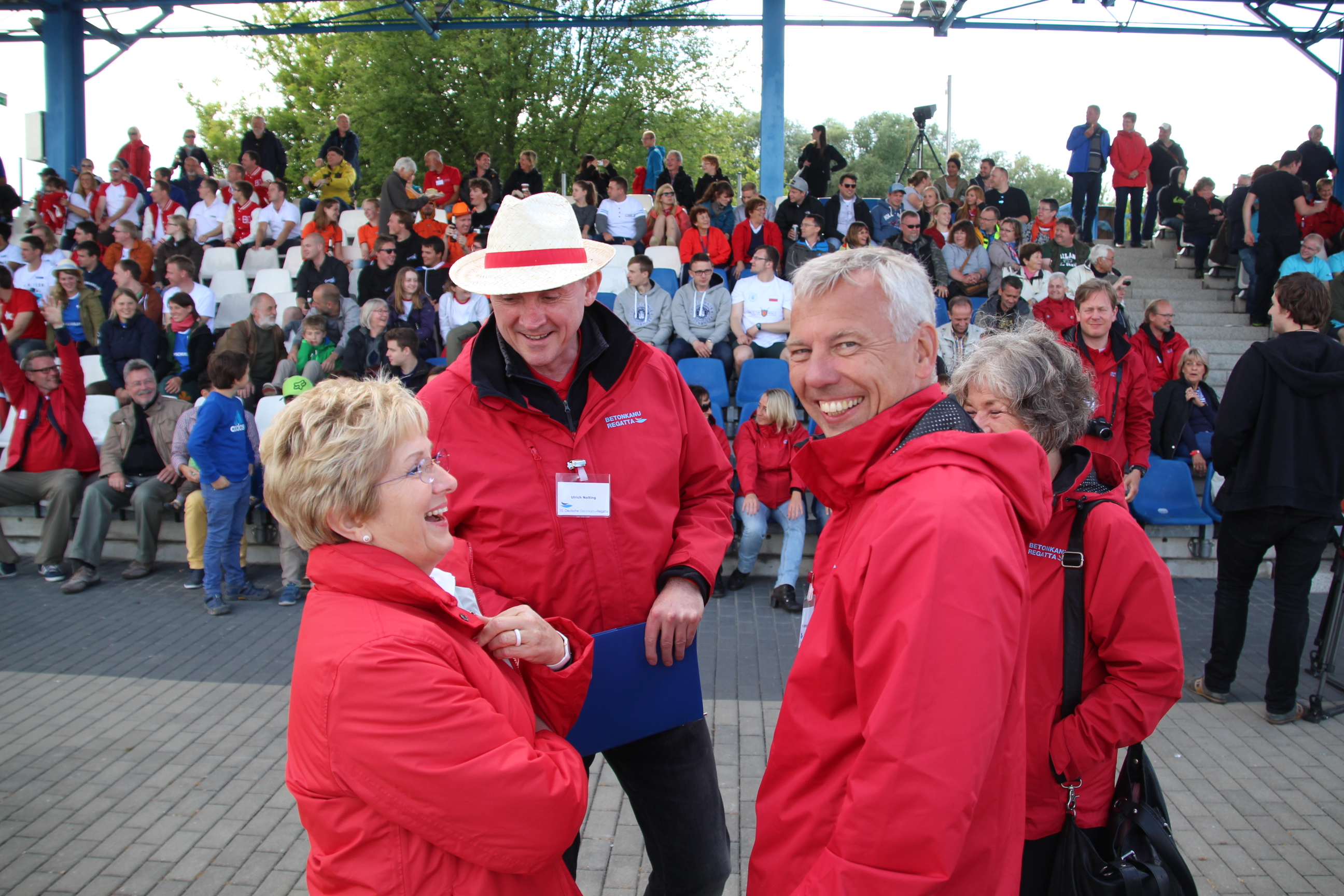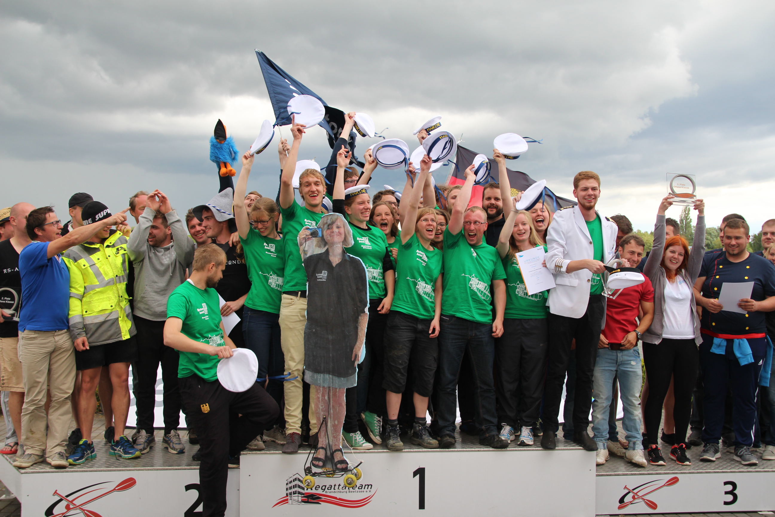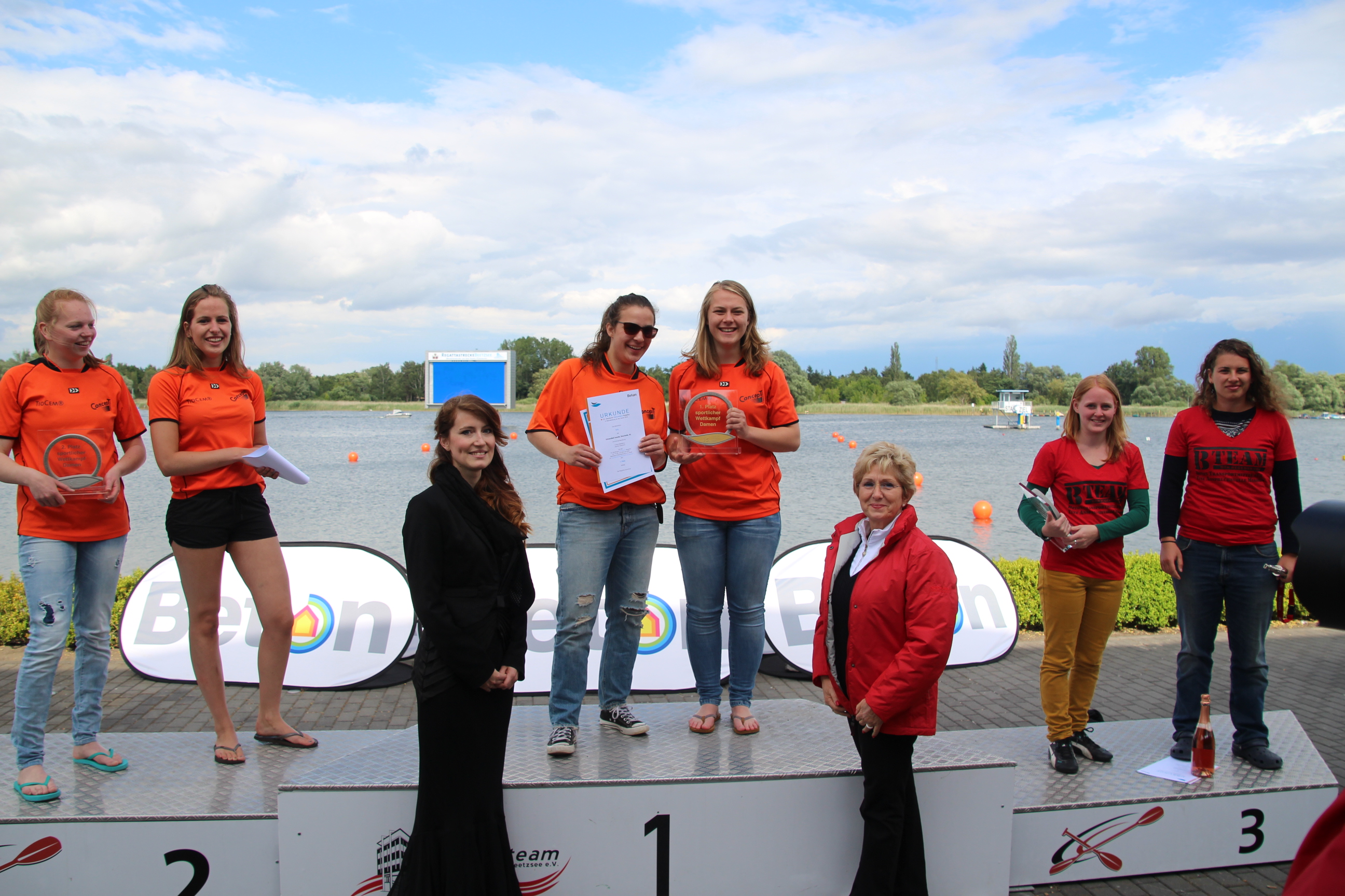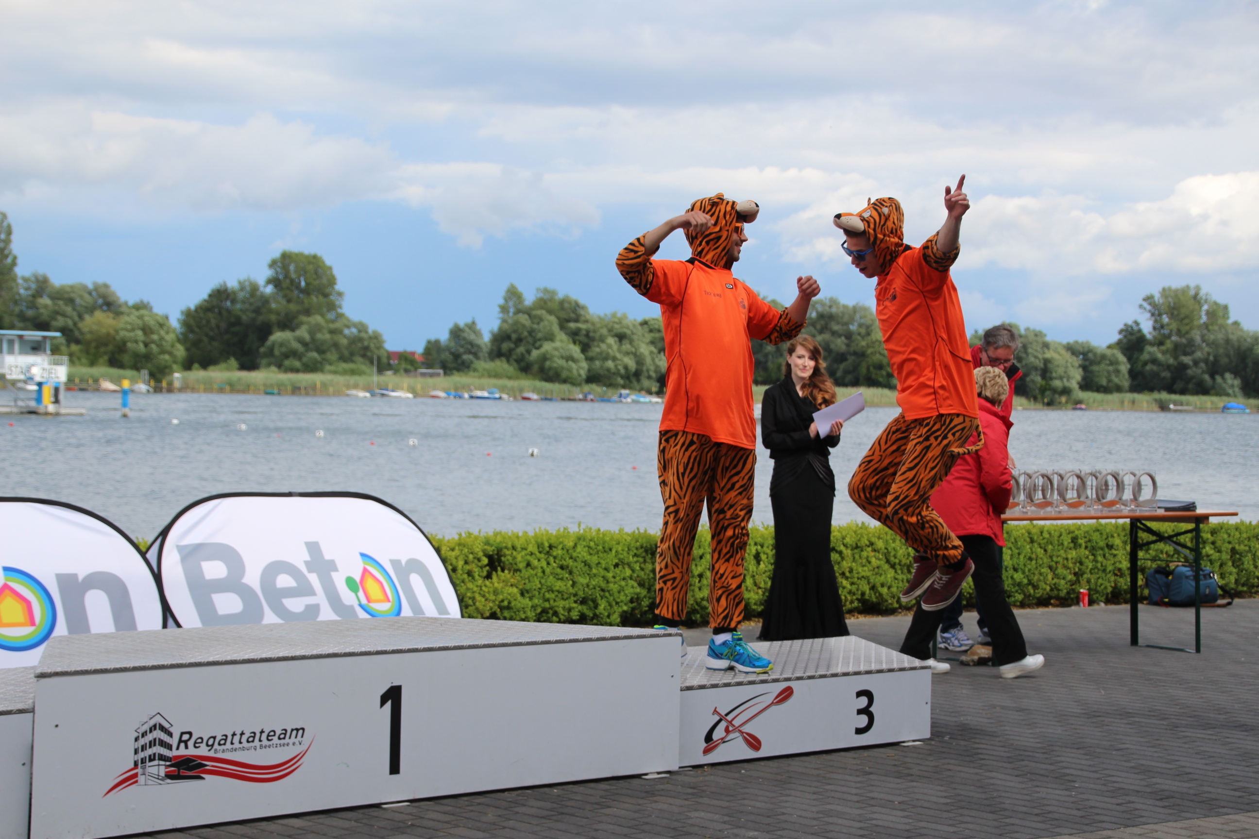 volle Tribünen auf der RegattastreckeLaola-WelleOberbürgermeisterin Dietlind Tiemann, Geschäftsführer Beton Marketing Süd Ulrich Nolting und Prof. Dr. Matthias Middel, Vorsitzender des Bundesverbandes der Deutschen Betoningenieure und der ZementindustrieAuszeichnung der Siegerboote (Betonbrouwers Enschede, NL) bei den Damenebenfalls Freude bei unseren holländischen NachbarnSiegerehrung bei den Herrenmit Spaß dabei: BB-Radio-Moderator Jens Herrmann und Dietlind Tiemannimmer noch ohne grünen Pulli, aber mit Spaß dabei: Christoph BiemannTeam „Hart wie Beton – leicht wie eine Wolke“am Ende verabschiedete sich die Regattastrecke Beetzsee mit einem Regenbogen