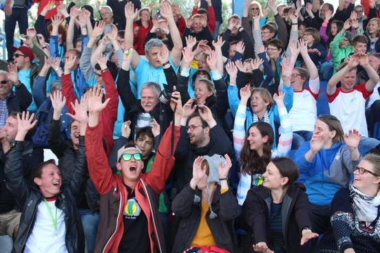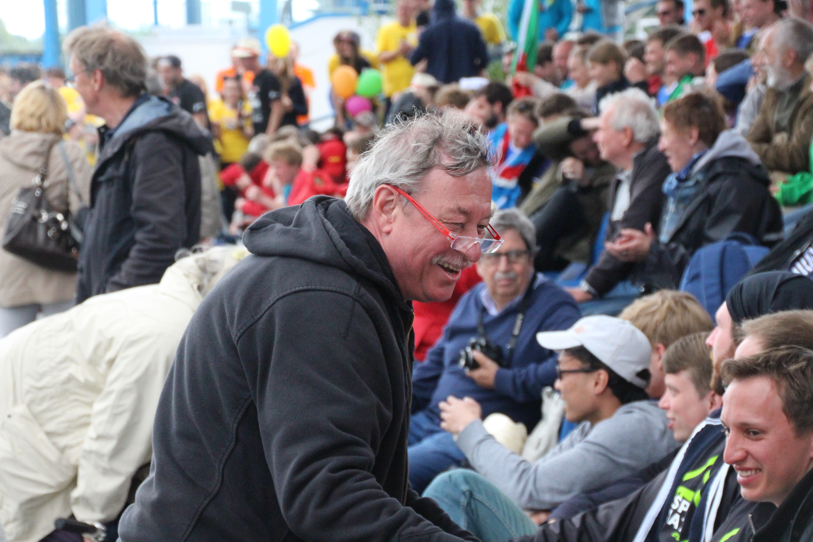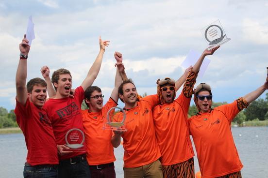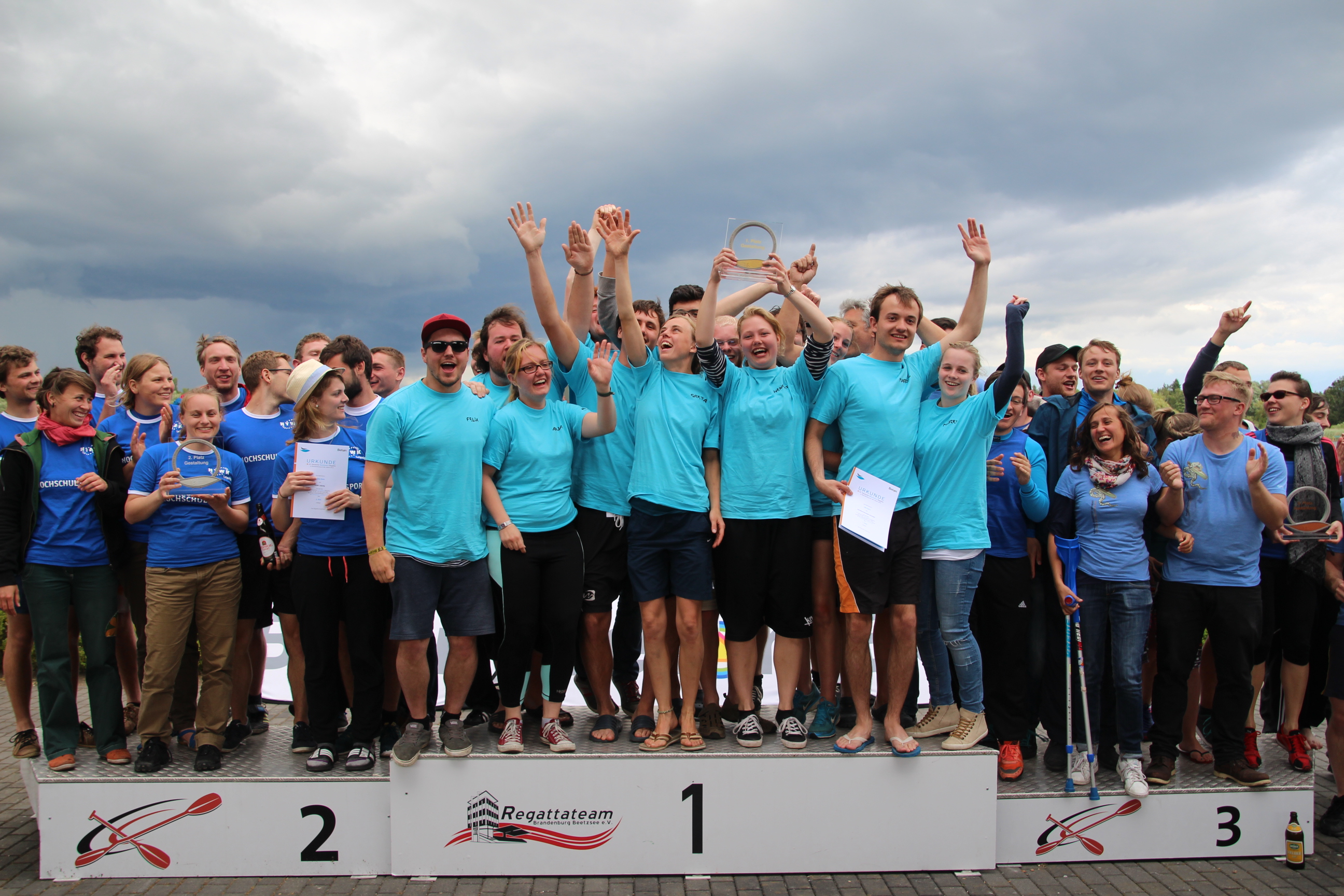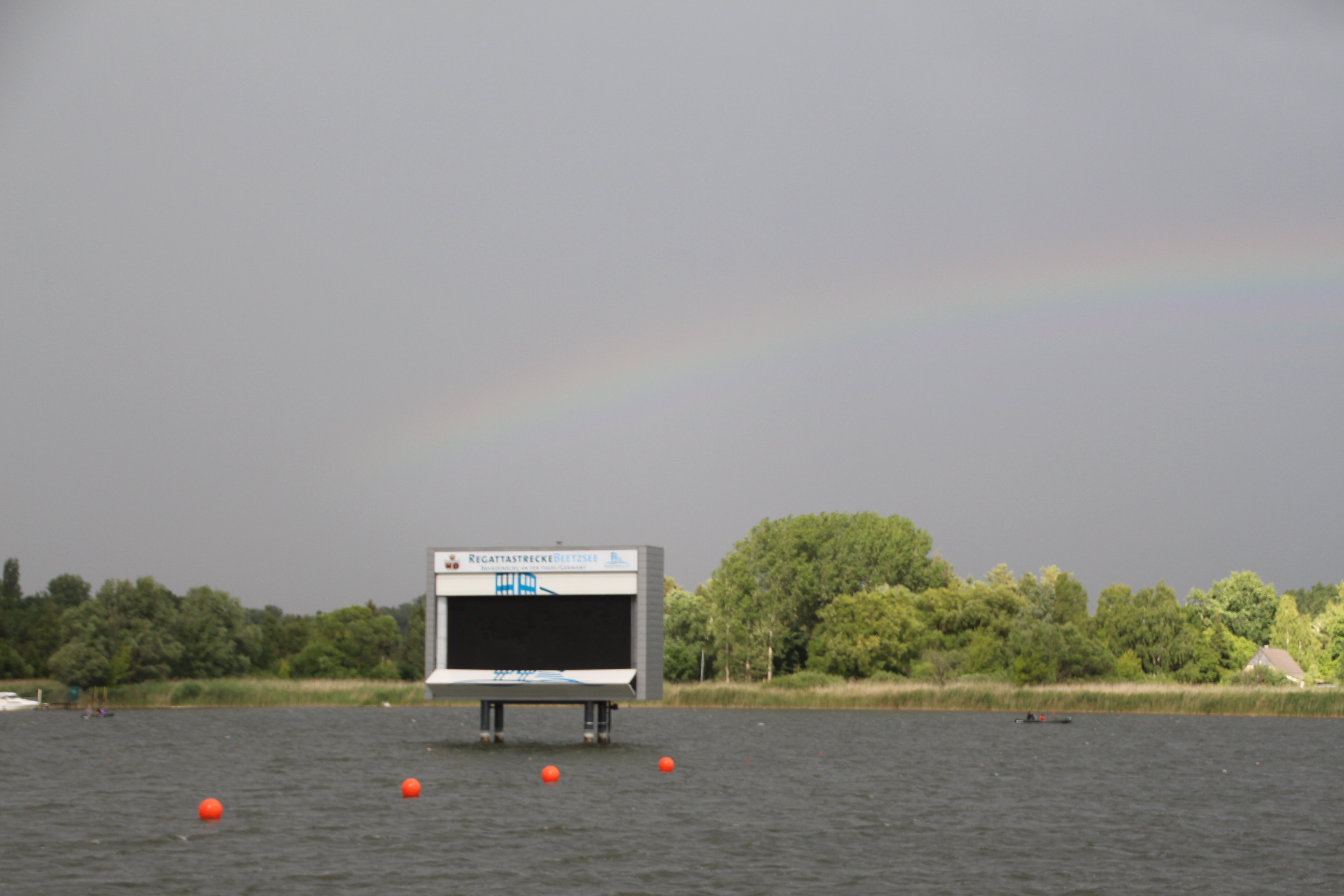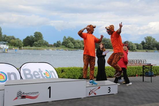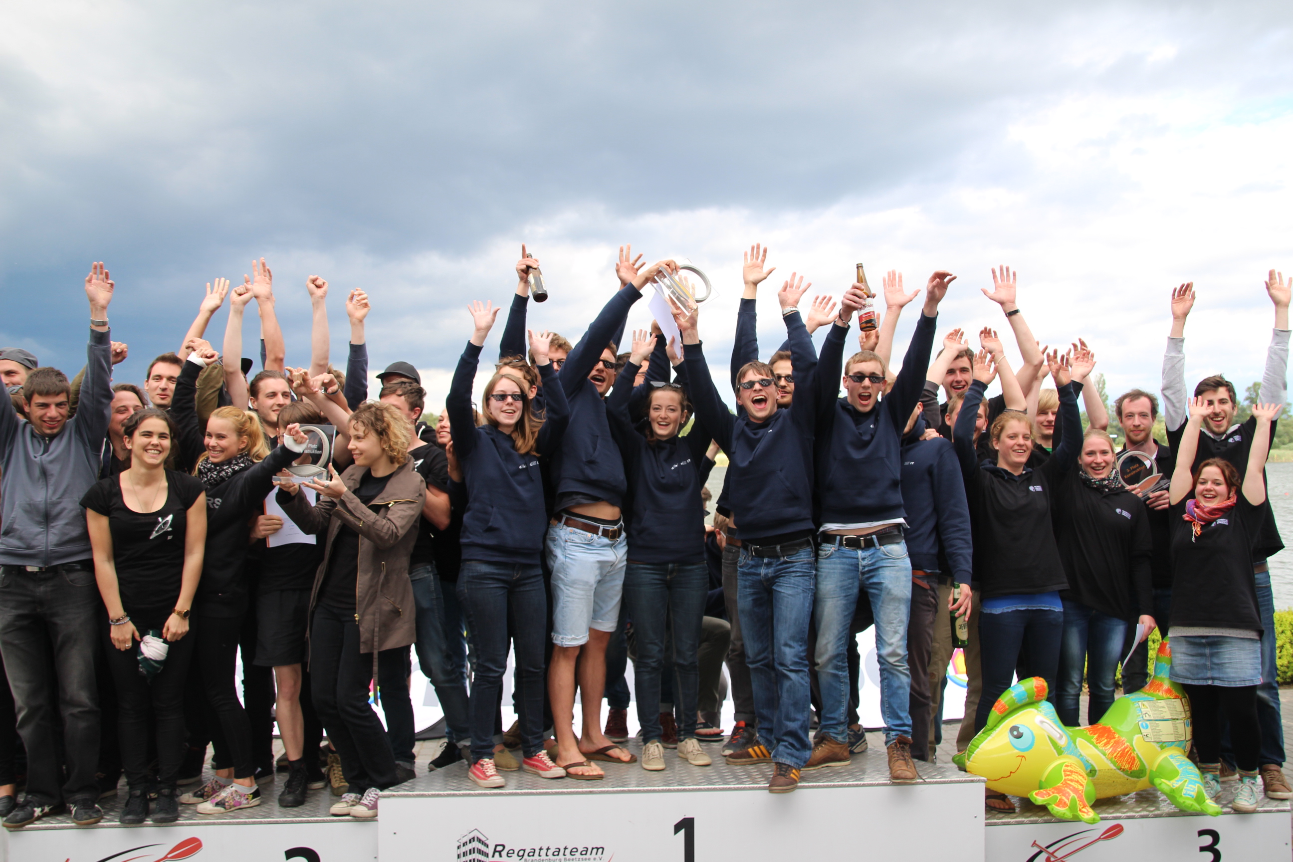 volle Tribünen auf der RegattastreckeLaola-WelleOberbürgermeisterin Dietlind Tiemann, Geschäftsführer Beton Marketing Süd Ulrich Nolting und Prof. Dr. Matthias Middel, Vorsitzender des Bundesverbandes der Deutschen Betoningenieure und der ZementindustrieAuszeichnung der Siegerboote (Betonbrouwers Enschede, NL) bei den Damenebenfalls Freude bei unseren holländischen NachbarnSiegerehrung bei den Herrenmit Spaß dabei: BB-Radio-Moderator Jens Herrmann und Dietlind Tiemannimmer noch ohne grünen Pulli, aber mit Spaß dabei: Christoph BiemannTeam „Hart wie Beton – leicht wie eine Wolke“am Ende verabschiedete sich die Regattastrecke Beetzsee mit einem Regenbogen