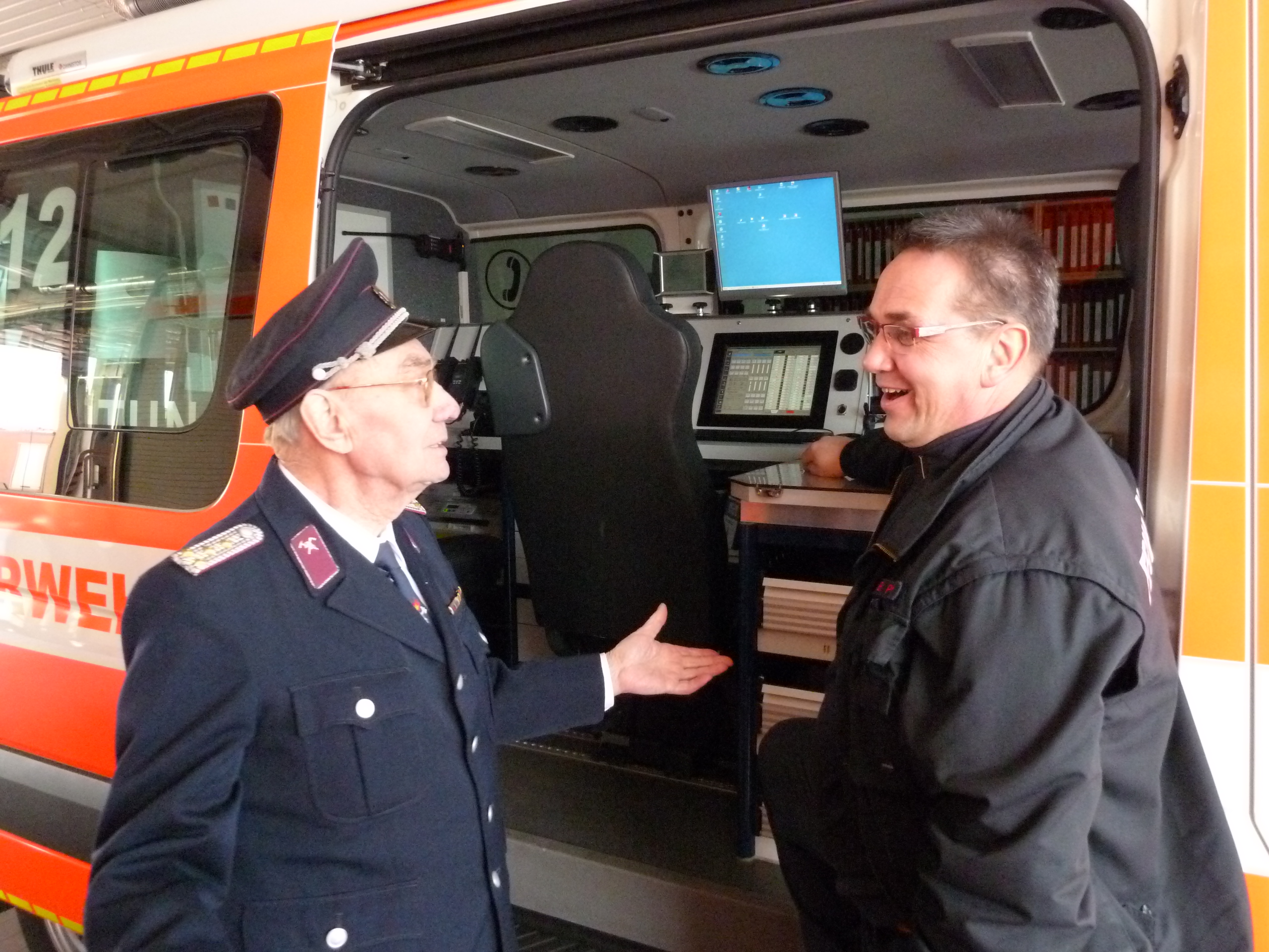 Nach einem kurzen Rundgang durch die Fahrzeughallen und die Regional-Leitstelle, bei dem sich der erfahrene Feuerwehrmann über die moderne Technik und die heutigen Alarmierungsabläufe bei Lösch- und Rettungseinsätzen informieren konnte, fand eine lockere Gesprächsrunde statt. Bei dieser Gelegenheit übrreichten die Oberbürgermeisterin und der Leiter der Berufsfeuerwehr eine Ehrenurkunde an Helmut Lendel und sprachen ihm Dank und Anerkennung für 70 Jahre treue Dienste um das Feuerwehrwesen in Brandenburg an der Havel aus.