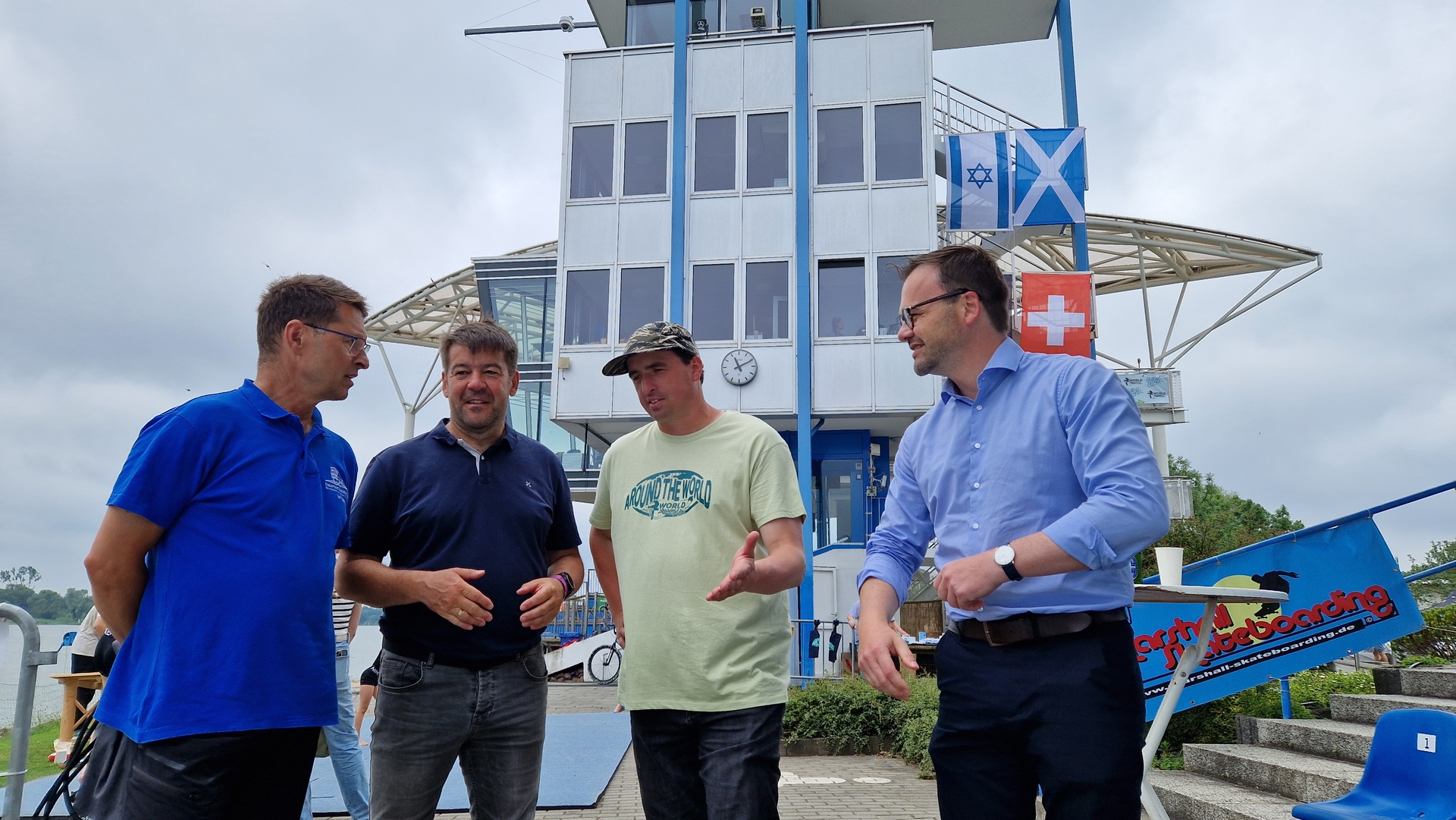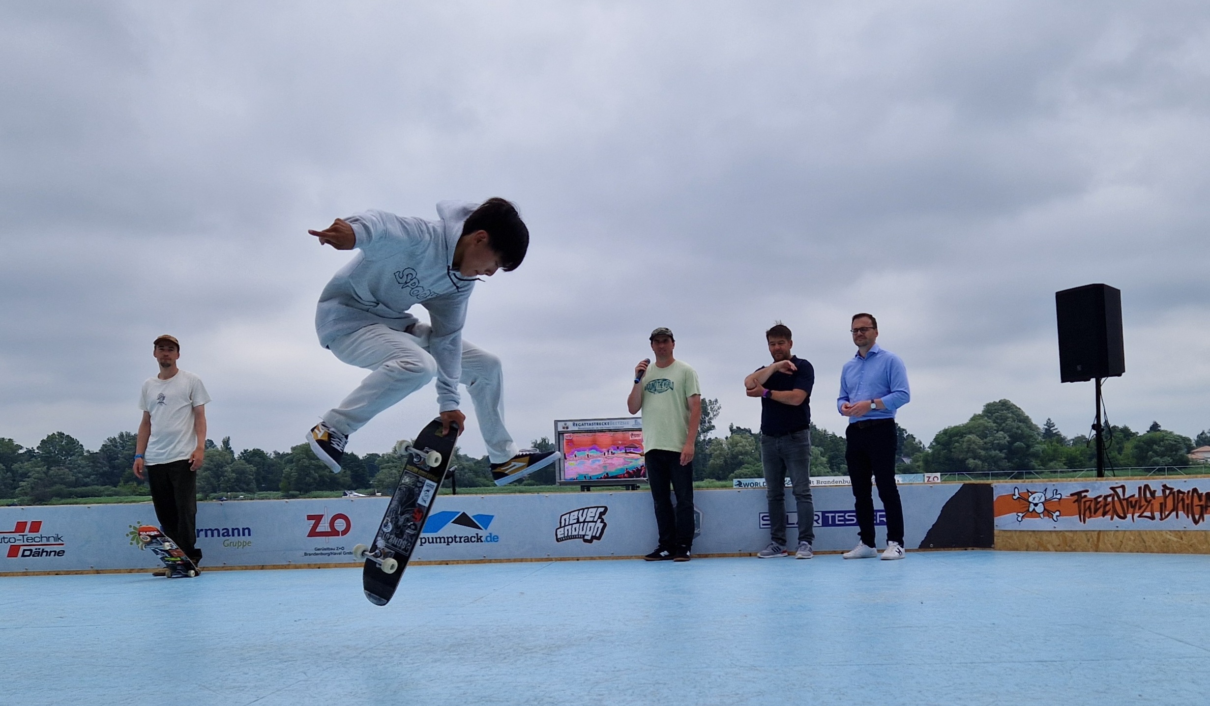 Wie vielfältig die Regattastrecke Beetzsee bespielt werden kann, offenbarte sich einmal mehr am letzten Juni-Wochenende. Vor der Tribüne wurden die „World Freestyle Skateboarding Championships“ ausgetragen, zu dessen Eröffnung Brandenburgs Sportminister Steffen Freiberg kam – und das nicht mit leeren Händen: Die Regattastrecke lobte er als einen der prominentesten Sportstandorte des Landes und für das Event überreichte er einen Fördermittelbescheid (aus Lottomitteln) in Höhe von 20.279 Euro an Christian Heise. Der skatet seit 1992 durch die Havelstadt, hat an unzähligen Wettbewerben teilgenommen und viele nach Brandenburg geholt und sorgte nun für die World Freestyle Skateboarding Championships am Beetzsee. Für deren Vorbereitung und Durchführung dankte er den 53 Helferinnen und Helfern, die ein ausuferndes, familientaugliches Veranstaltungsgelände vorbereitet hatten, mit vielen Spiele-, Bewegungs- und Teststationen, einigen Verkaufsständen, diversen kulinarischen Beiträgen und guter Unterhaltung.