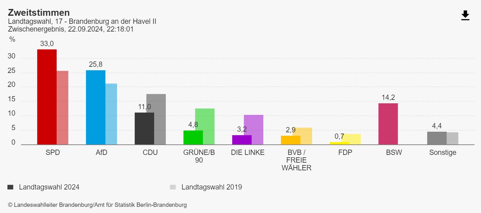 Alle weiteren Ergebnisse, auch die der abgeschlagenen Parteien Grüne/Bündnis 90, Die Linke, BVB/Freie Wähler und FDP sind hier zu finden.