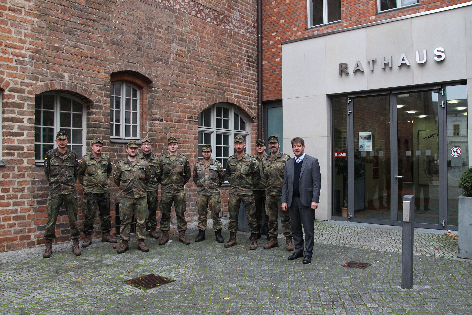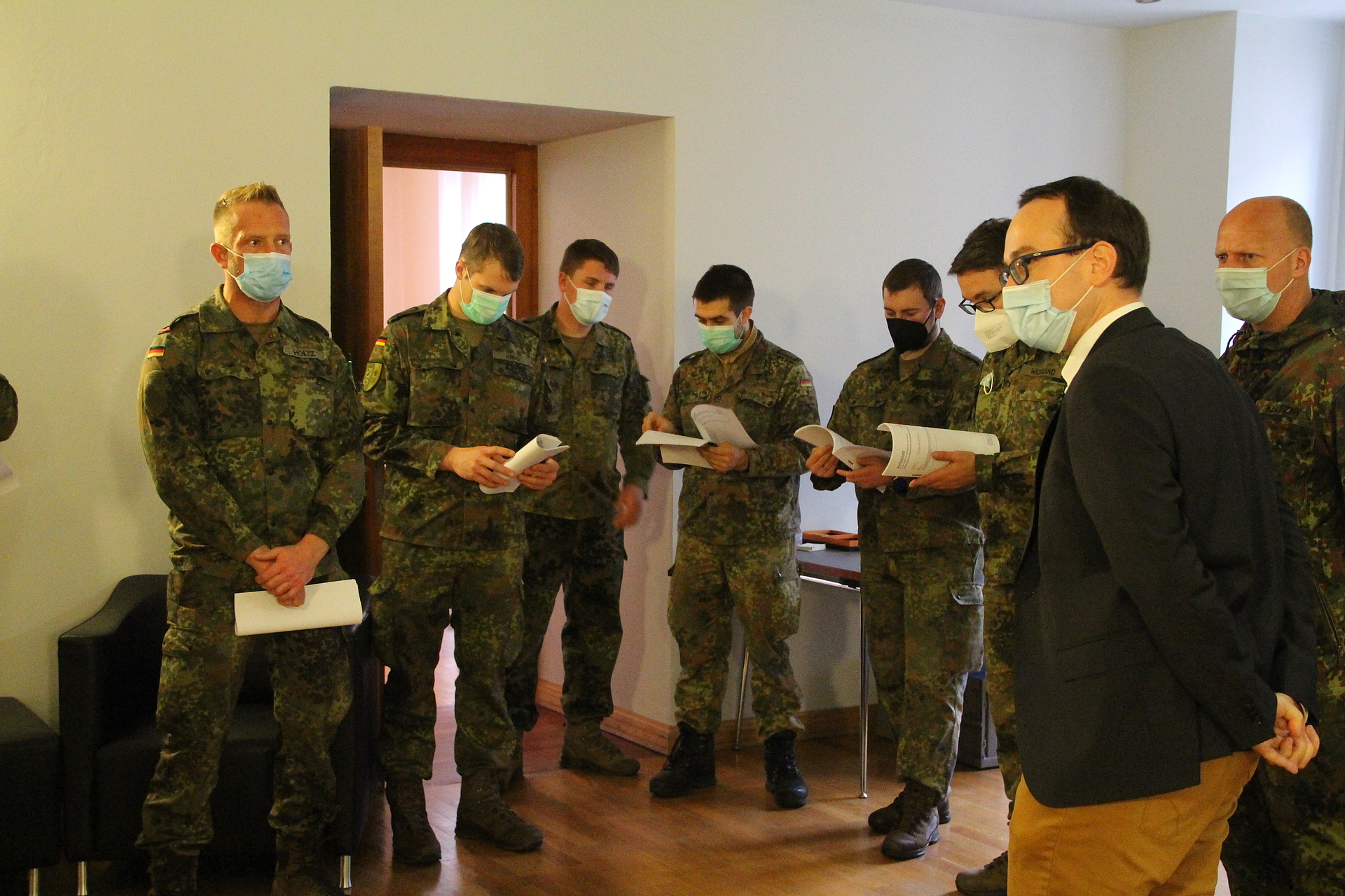Oberbürgermeister Steffen Scheller und Mitarbeiter des Gesundheitsamtes begrüßten die Soldaten und informierten sich nach weiteren Bedarfen, um ihnen einen guten Einstieg zu ermöglichen. Steffen Scheller dazu: