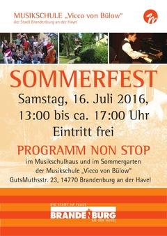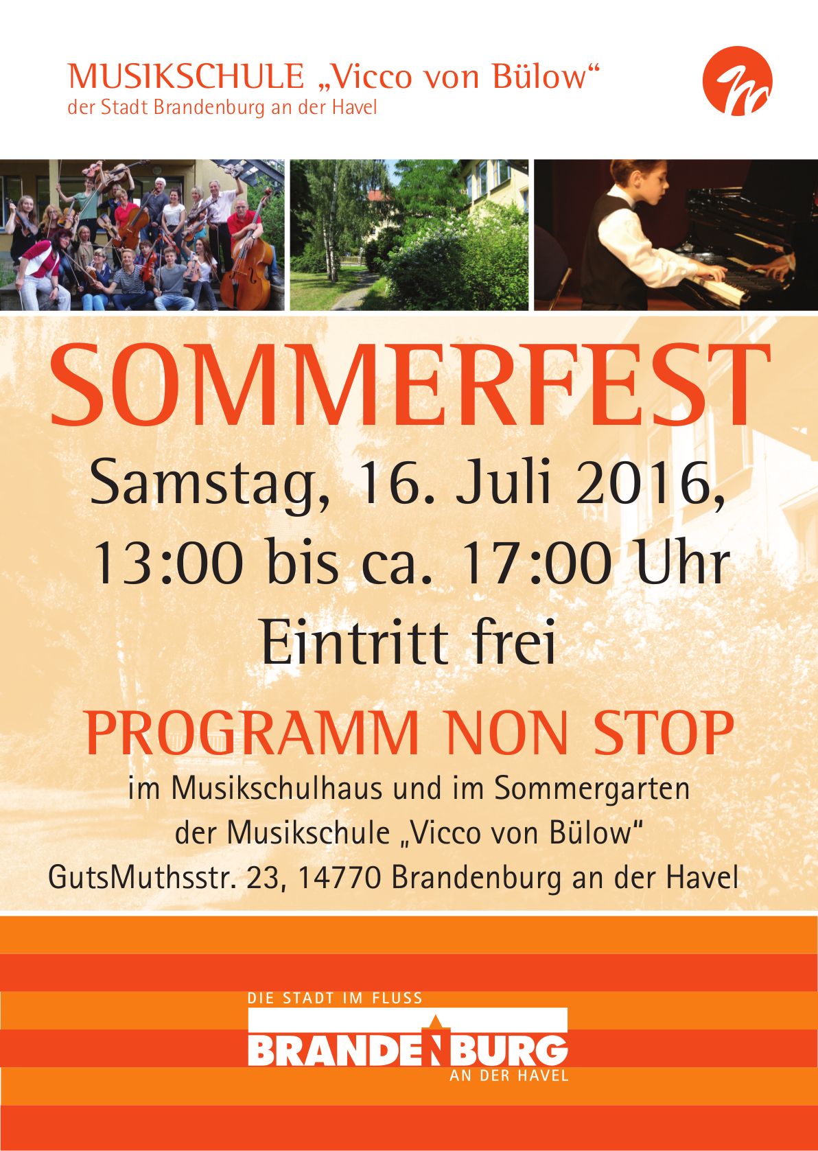 Am Samstag, dem 16. Juli 2016 findet auf dem Gelände und im Gebäude der Musikschule „Vicco von Bülow“, GutsMuthsstraße 23, das alljährliche Sommerfest zum Abschluss des Schuljahres 2015/2016 statt. Seit 1998 gibt es dieses Fest, auf dem viele Musikschülerinnen und -schüler in Ensembles, Kammermusikgruppen oder auch als Solisten zeigen, was sie für ihr Publikum erarbeitet haben.