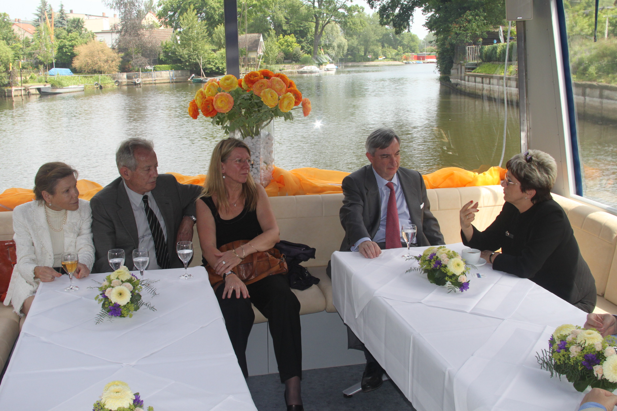 Weiter ging es mit einem Boot der Havel Marin vom Salzhofufer zum Dom. Dommuseumsleiter Dr. Rüdiger Frhr. von Schnurbein und der kaufmännischen Leiter Domstiftsrentmeister Dr. Wolframa Diederichs führten die Gäste durch den Dom zu Brandenburg. S.E. Herr Rafael Dezcallar de Mazarredo war so begeistert, dass er auch noch die St. Katharinenkirche besuchte. Ein kurzer Eintrag in das Kirchenbuch war der letzte offizielle Akt des spanischen Repräsentanten. Bei der Verabschiedung überreichte Oberbürgermeisterin Tiemann dem spanischen Botschafter noch einen Stadtkoffer, der mit aktuellen touristischen Broschüren der Havelstadt gefüllt war.