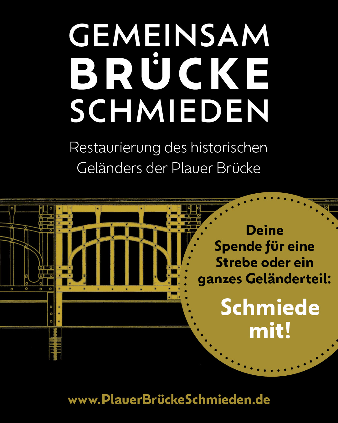 Mit dem Ziel, der alten Plauer Brücke Stück für Stück ihr historisches Jugendstilgeländer insgesamt zurückzugeben, bemüht sich die Bürgerinitiative „Alte Plauer Brücke“ gemeinsam mit dem Denkmalschutz um Finanzierungs- und Fördermöglichkeiten und hofft dazu auch weiterhin auf zahlreiche Spenden, um die notwendigen Eigenmittel zur Verfügung stellen zu können.