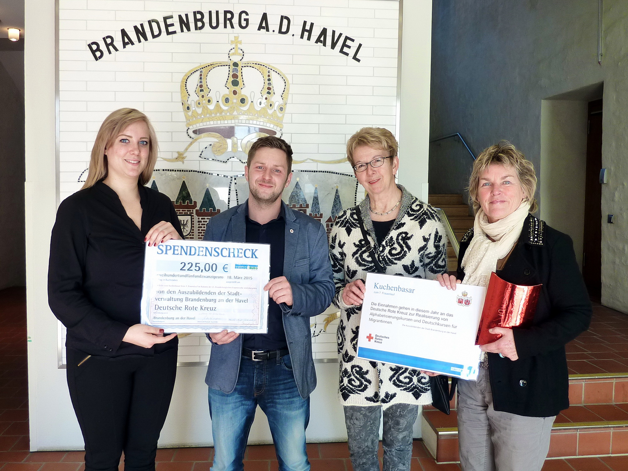 Die Vertreterin der Auszubildenden der Stadtverwaltung Brandenburg an der Havel Katja Kauffmann übergab gemeinsam mit der Gleichstellungsbeauftragten der Stadt, Kornelia Köppe und Martina Voigt vom VFL Brandenburg, am Mittwoch, 18.03.2015 einen Spendenscheck in Höhe von 225 Euro an Andreas Griebel, Vorstandsmitglied des Deutschen Roten Kreuzes.