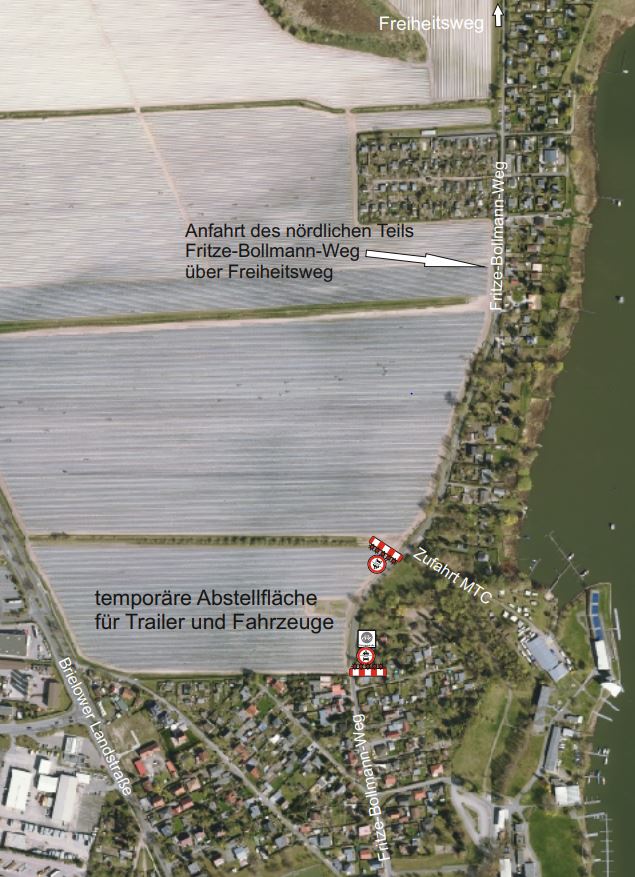 Bereits ab Montag, dem 9. September, um 08:00 Uhr wird der Fritze-Bollmann-Weg ab dem Beginn der Fahrradstraße in Richtung Brielow sowie in entgegengesetzter Richtung hinter der Zufahrt des Motoryacht- und Touristikclubs (MTC) bis in die Abendstunden des 15. September für den Kraftfahrzeugverkehr gesperrt. Anlieger hinter der MTC-Zufahrt müssen ihre Grundstücke über den Freiheitsweg erreichen. Die Sperrung gilt nicht für Radfahrer, die weiterhin die Strecke nutzen können.