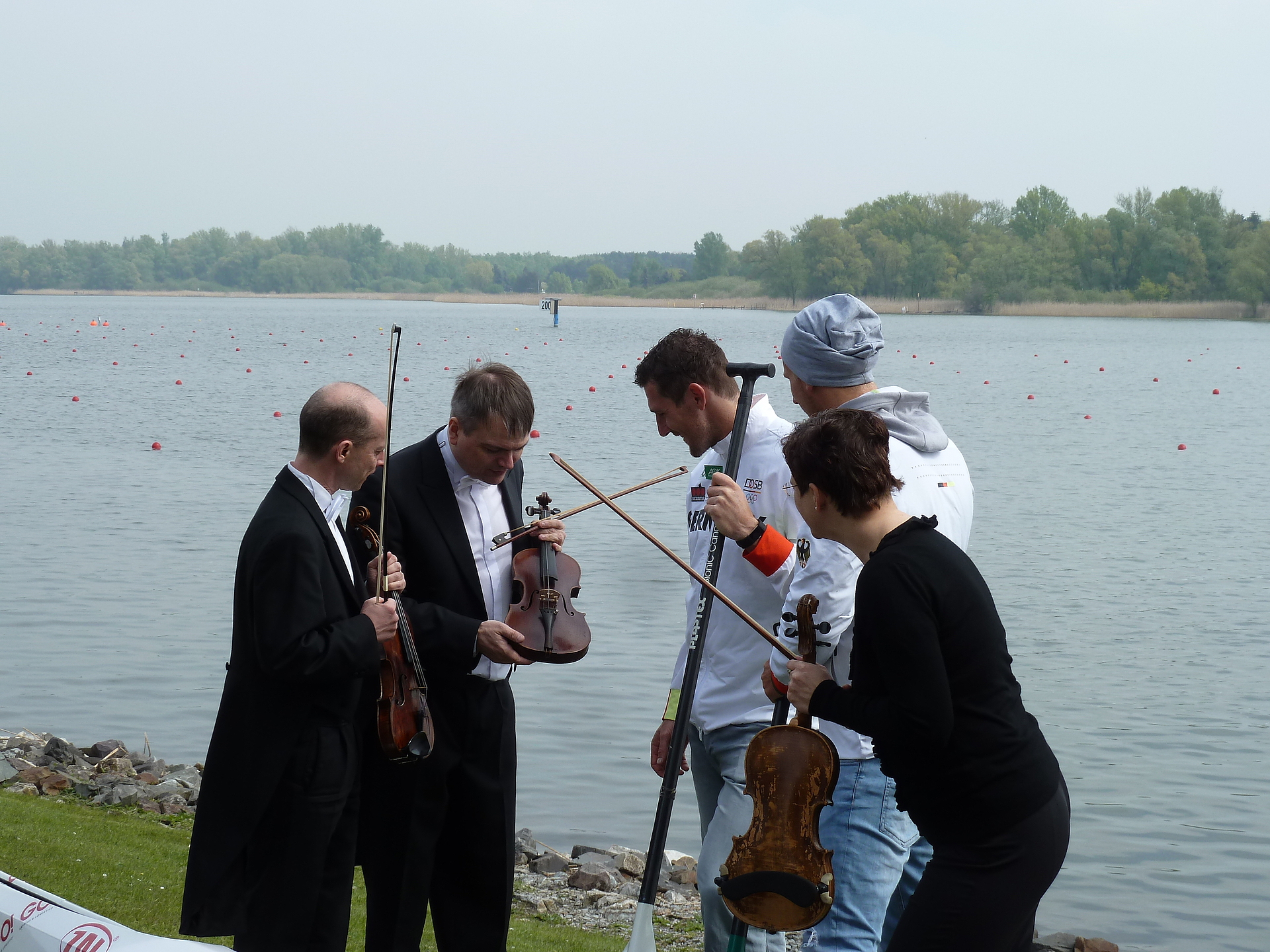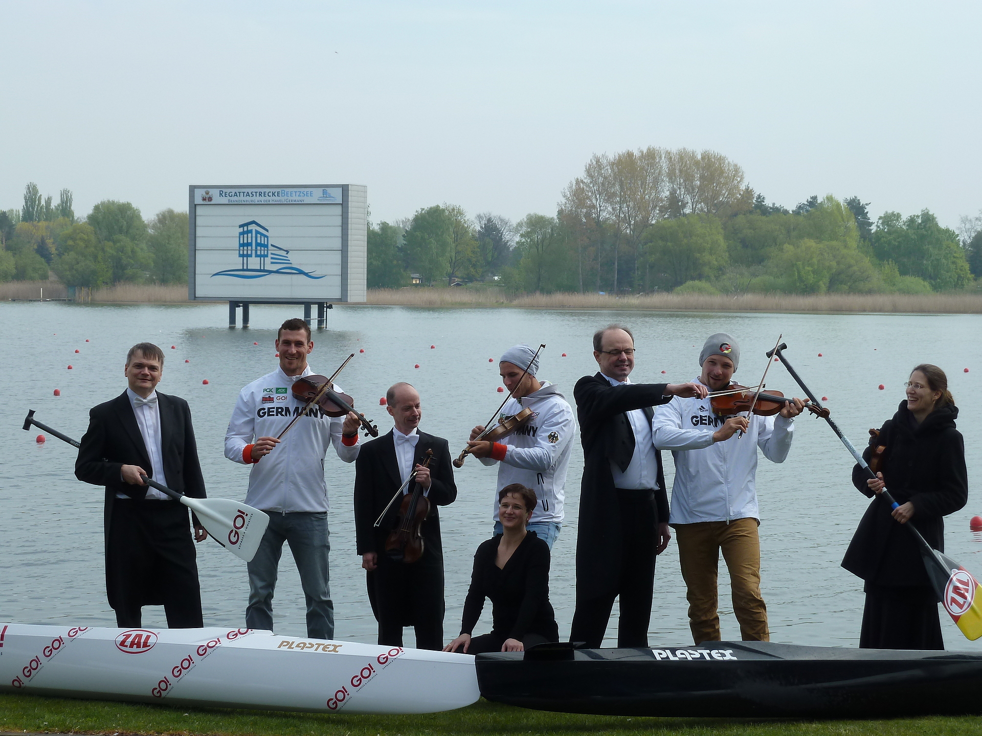 Wie es der Zufall manchmal will, trainieren derzeit Deutschlands beste Canadier-Kanuten auf dem Beetzsee für die am Wochenende dort stattfindende Testregatta der Nationalmannschaft. Da kam Regattastrecken-Chef Uwe Philipp auf die Idee, die Spitzenmusiker und die Spitzensportler „in ein Boot zu setzen“. In einer Trainingspause stellten sich Dreifach-Olympiasieger Sebastian Brendel, Olympiasieger Jan Vandrey und Olympiateilnehmer Stefan Kiraj für Gruppenfotos mit den Brandenburger Symphonikern zur Verfügung. Dabei wurden dann auch mal die „Arbeitsgeräte“ getauscht, so dass die erfolgreichen Ausnahme-Kanuten mit Geigen und Hörnern posierten und die Künstler die Stechpaddel in der Hand hielten.