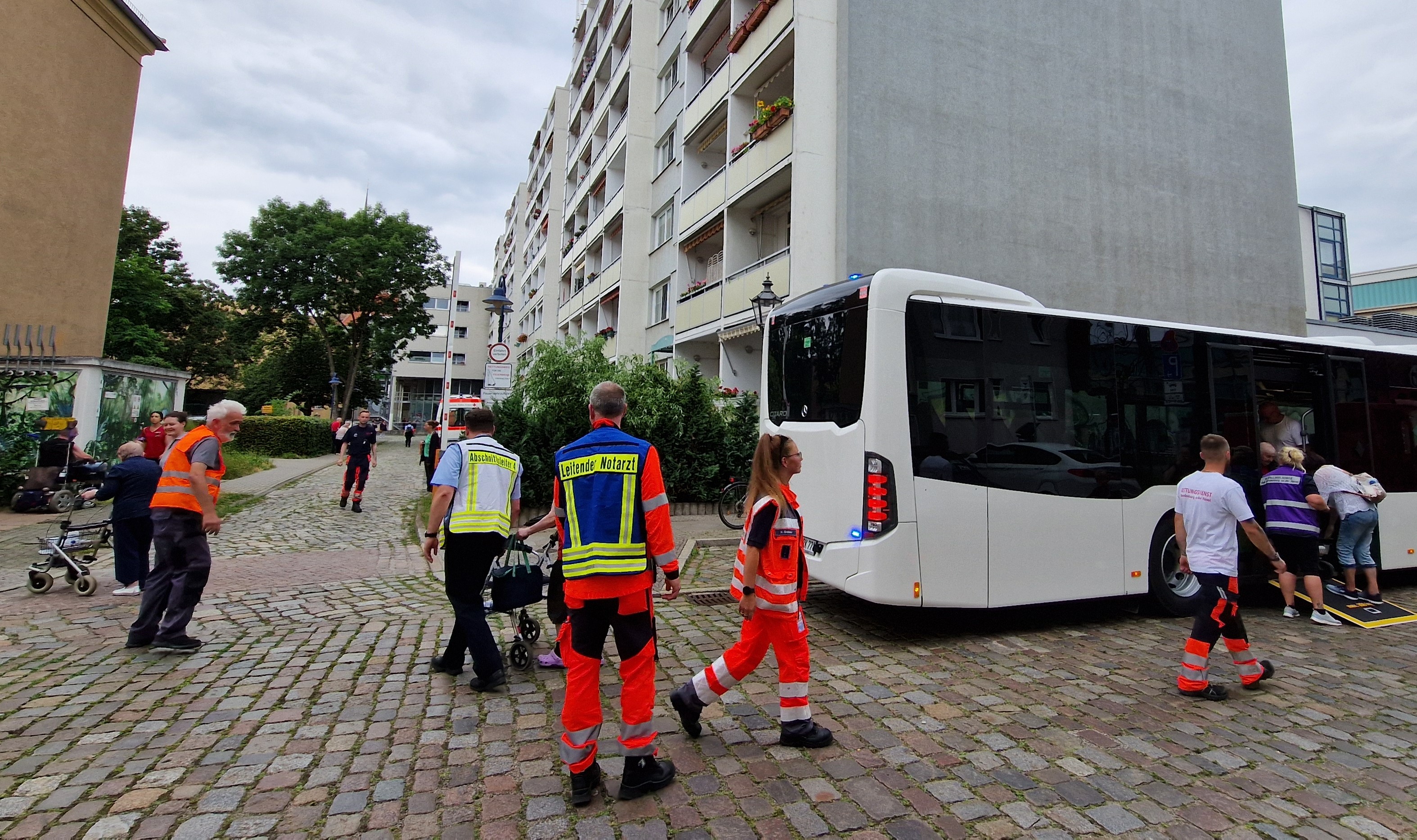 Oberbürgermeister Steffen Scheller und der Beigeordnete Thomas Barz waren lange Zeit vor Ort, sprachen mit Einsatzkräften sowie mit Evakuierten und sie halfen bei der Organisation des Einsatzes, an dem neben Polizei und Feuerwehr auch Rettungsdienste (Johanniter und DRK), Pflegedienste und Seelsorger zum Einsatz kamen. Ihnen allen – wie auch den involvierten Verkehrsbetrieben und Stadtwerken – sprach Steffen Scheller einen großen Dank für den reibungslosen Einsatz aus, bei dem erstmals auch der nagelneue Katastrophenschutzbus des DRK zum Einsatz kam, um die zumeist ältere Bewohnerschaft des betroffenen Wohnblocks heimzubringen.
