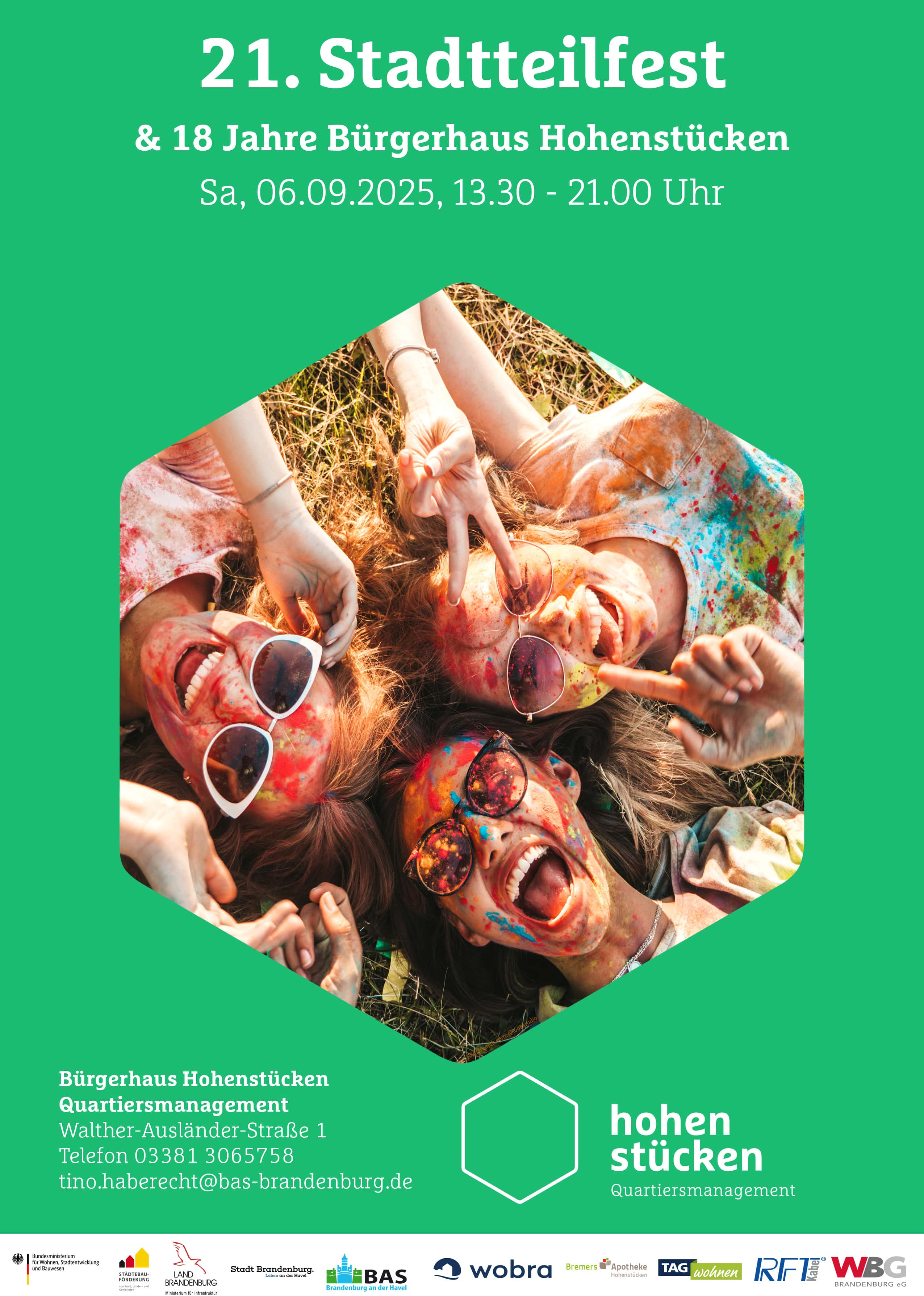 Am Samstag, 6. September 2025, ist auf dem Platz zwischen Walther-Ausländer-Straße und Tschirchdamm ab 13:30 Uhr das alljährliche Stadtteilfest Hohenstücken zu erleben. Es ist die 21. Auflage dieses bunten Festtages, mit dem zugleich dem 18. Geburtstag des Bürgerhauses Hohenstücken Rechnung getragen wird.