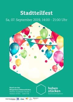 Am Samstag, dem 07.09.2019, lädt das Quartiersmanagement Hohenstücken zu einem Fest für die ganze Familie. Ab 14:00 Uhr wird rund um das Bürgerhaus Hohenstücken und auf dem Marktplatz in der Walther-Ausländer-Straße 1 das 17. Stadtteilfest in Verbindung mit dem 12. Geburtstag des Bürgerhauses gefeiert.