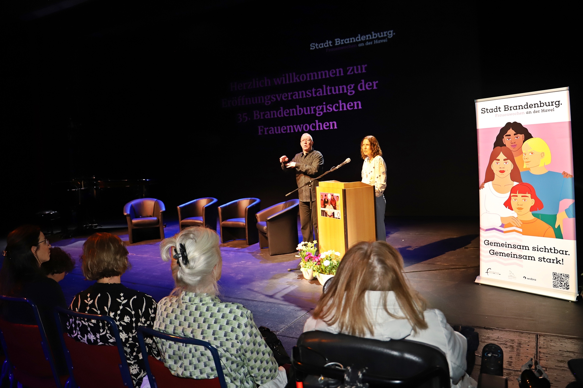 Mit einer feierlichen Auftaktveranstaltung wurden am Montag, den 3. März, die 35. Brandenburgischen Frauenwochen durch den Oberbürgermeister Steffen Scheller und die Gleichstellungsbeauftragte Jeannette Horn in der zahlreich besuchten Studiobühne des Brandenburger Theaters eröffnet. Durch das Programm führte Dr. Katarzyna Wojcik, während Philipp Langhans und Charlotte Lau von der Freien Musikschule Brandenburg für die musikalische Untermalung sorgten. Unter der Regie von Steffan Drotleff wurden eindrucksvolle Kurzfilme des Jugendtheaters Brandenburg mit Alltagszenen gezeigt, die das Zusammenleben junger Menschen in der Havelstadt thematisierten – ebenso wie mögliche Herausforderungen.