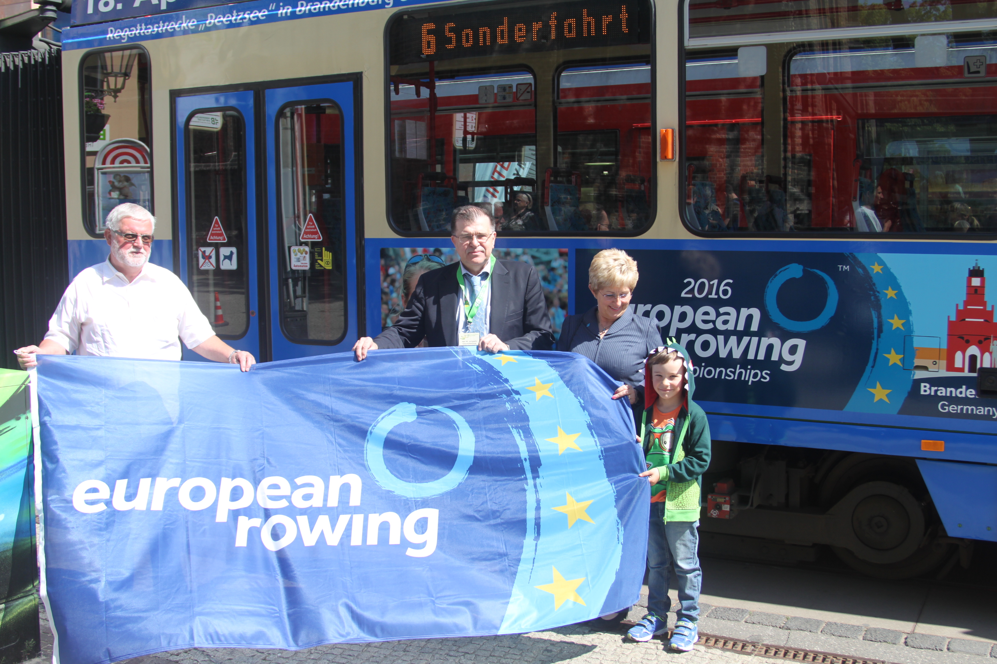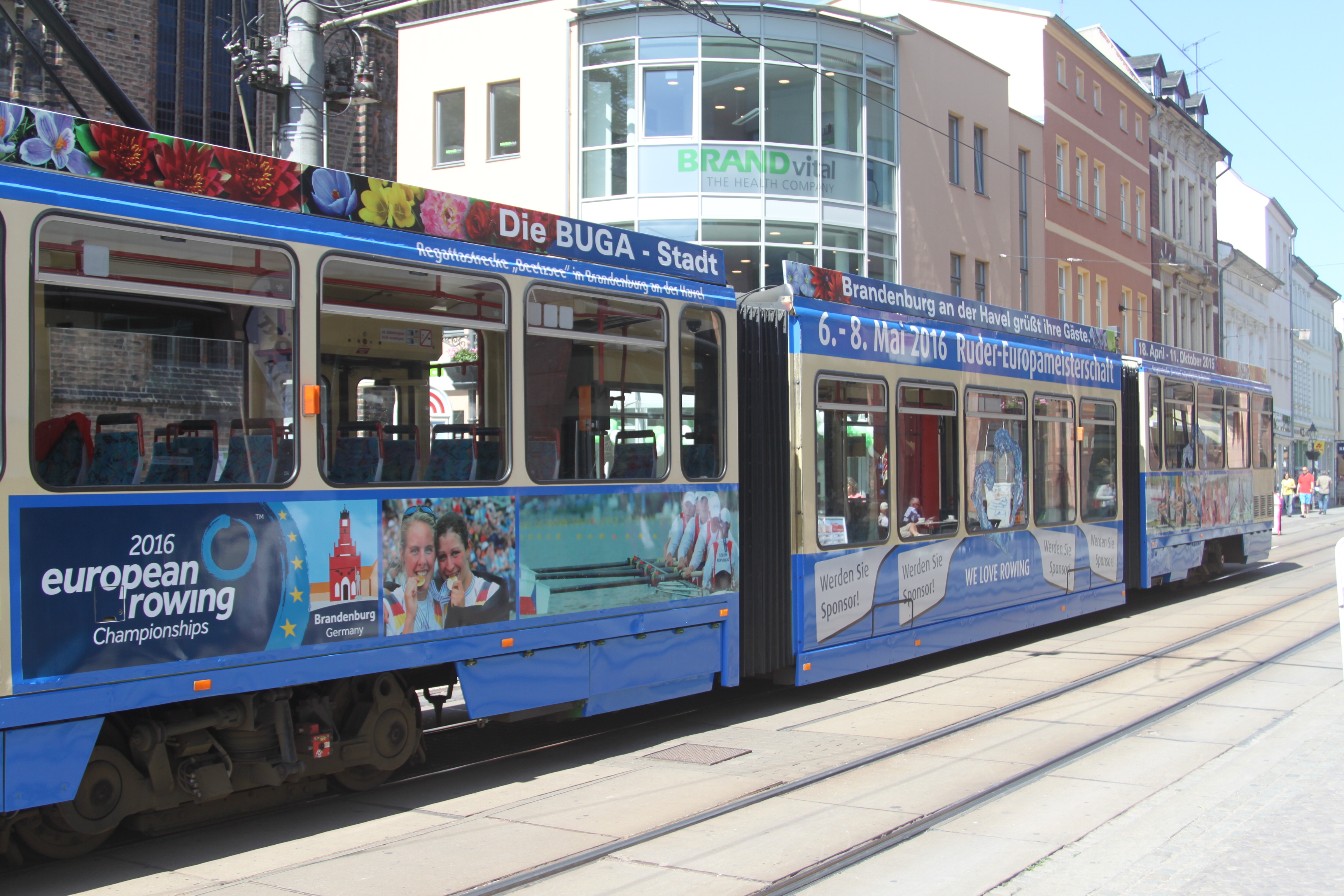 Gemeinsam mit Oberbürgermeisterin Dr. Dietlind Tiemann haben Hartmut Duif, Ehrenpräsident des Landesruderverbandes Brandenburg e.V. (LRV), und Mitglieder des Organisationsteams für die Ruder-Europameisterschaften 2016 am Donnerstag, 04.06.2015 im Zentrum von Brandenburg an der Havel die „EM-Straßenbahn“ präsentiert. Das moderne fahrzeug der Verkehrsbetriebe Brandenburg an der Havel GmbH (VBBr) ist mit dem EM-Logo sowie Ruder-Motiven und Bildern von der Regattastrecke „Beetzsee“ beklebt, wo Anfang Mai kommenden Jahres die nächsten europäischen Titelkämpfe stattfinden. Mit dieser besonderen Werbemaßnahme soll schon jetzt auf das internationale Sportereignis der Spitzenklasse aufmerksam gemacht und Sponsoren die Möglichkeit zur Präsentation gegeben werden.