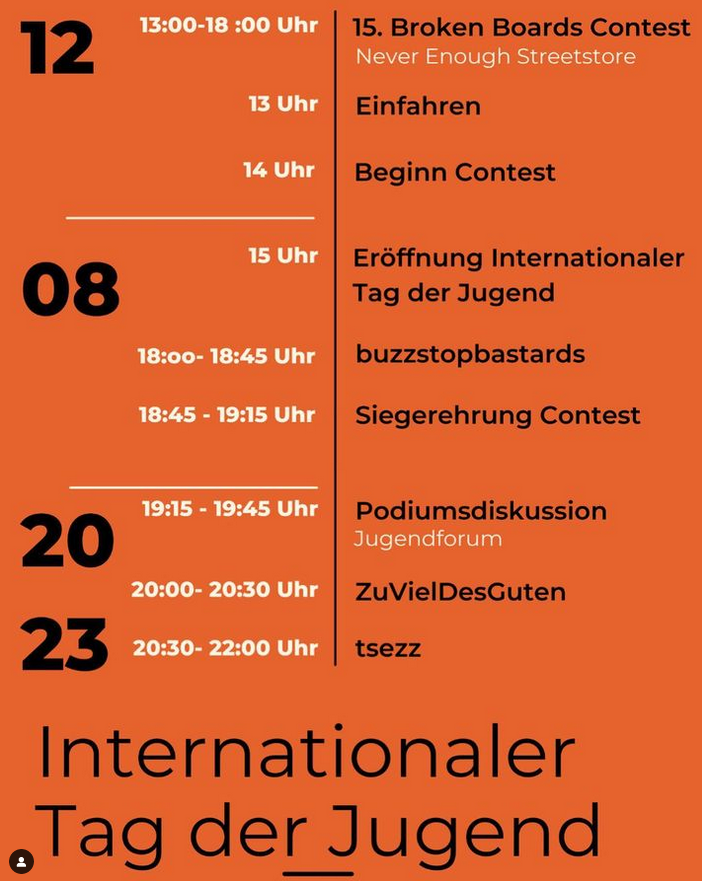 Für den spektakulären Auftakt des Jugendtages sorgt mit Sicherheit der 15. Broken Boards Skateboard Contest. Die Jugendlichen erwartet dann ein bunter Mix aus vielen zeitgemäßen Aktivitäten (darunter Graffiti-Kunst, eine entspannte Chill Area, ein actionreicher Luftkissen-Parcours des THW, eine Fahrt mit dem Rettungsboot der DLRG, Kleidertausch, Fotobox der Brandenburger Bank, Basketball und vieles mehr). Zusätzlich gibt es spannende Inspirationen durch den Stammtisch „Havel der Vielfalt“ und die Bewegung „Freitags for Future“.
