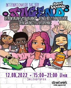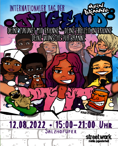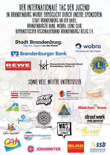Unter der Schirmherrschaft von Oberbürgermeister Steffen Scheller laden die Streetworkerinnen des Humanistischen Regionalverbandes Brandenburg/Belzig e.V. in Kooperation mit dem städtischen Streetworker und der Kinder- und Jugendbeauftragten der Stadt, Katharina Bergholz, anlässlich des „Internationalen Tages der Jugend“ zu einem Event am Freitag, dem 12.08.2022 von 15:00 bis 21:00 Uhr am Salzhofufer ein.