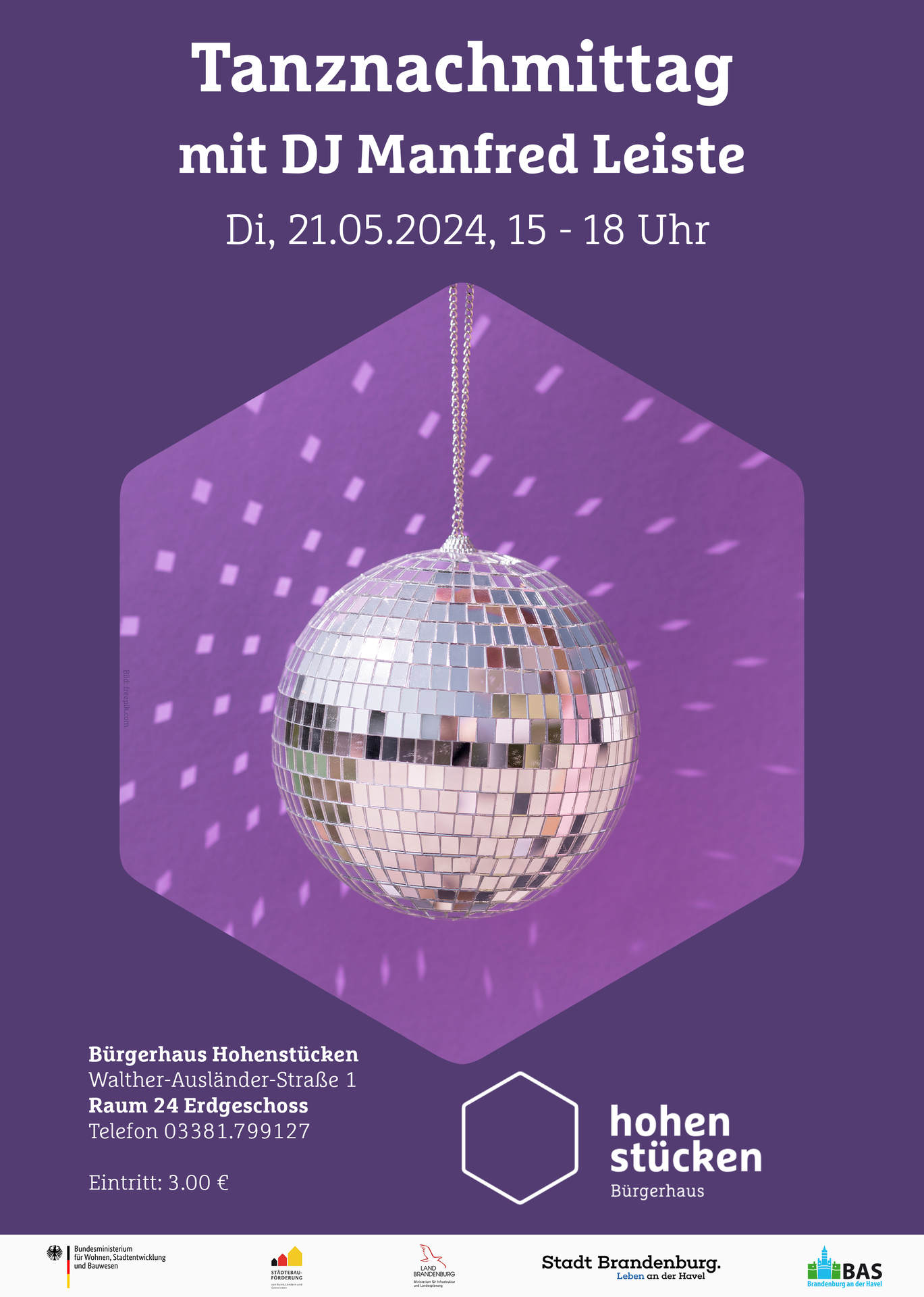 Am 21. Mai 2024 (Dienstag) findet im Bürgerhaus Hohenstücken, Walther-Ausländer-Straße 1, der nächste Tanznachmittag statt – diesmal mit DJ Manfred Leiste aus Plaue.