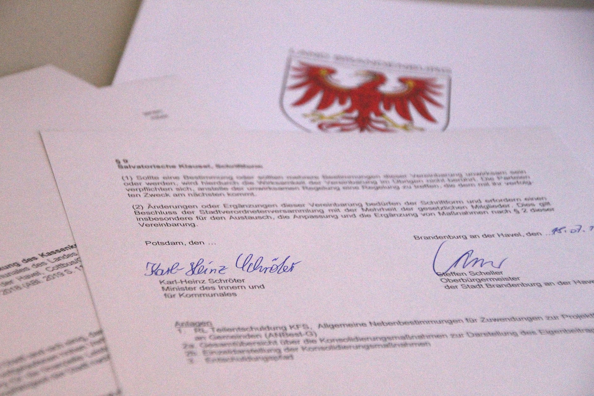 Oberbürgermeister Steffen Scheller und Innenminister Karl-Heinz Schröter haben im Altstädtischen Rathaus die Konsolidierungsvereinbarung zur Teilentschuldung unterzeichnet. Ziel ist es, den kommunalen Kassenkreditbestand in Höhe von 118.427.560,22 Euro (Stand: 31.12.2018) bis zum 31.12.2023 um 73.223.665,92 Euro auf 45.203.894,30 Euro abzusenken. Der Teilentschuldungsanteil des Landes beträgt 58.578.932,74 Euro und wird in fünf Jahresscheiben ausgezahlt. Die Stadt verpflichtet sich zu einem zehnprozentigen Eigenanteil in Höhe von 14.644.733,18 Euro.