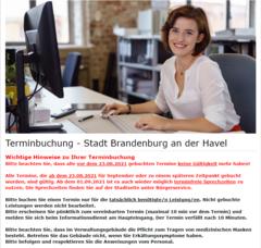 Wie bereits veröffentlicht, ändert sich ab 01.09.2021 das Terminmanagement im Bürgerservice der Stadt Brandenburg an der Havel. Aufgrund dessen war die Stornierung aller bereits vor dem 23.08.2021 gebuchten Termine für den Zeitraum ab 01.09.2021 notwendig.