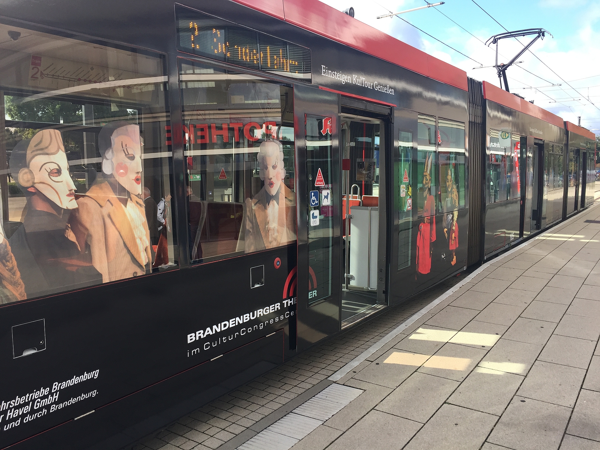 Kurz vor dem Festakt zum 200jährigen Jubiläum des Brandenburger Theaters am 5. Oktober 2017 nimmt die Brandenburger Theatertram ihre Fahrt auf. Oberbürgermeisterin Dr. Dietlind Tiemann und Klaus Deschner, Geschäftsführer der Brandenburger Theater GmbH, weihten feierlich am Freitag, 15.09.2017, und unter Begleitung der Brandenburger Symphoniker die Theater-Straßenbahn ein.