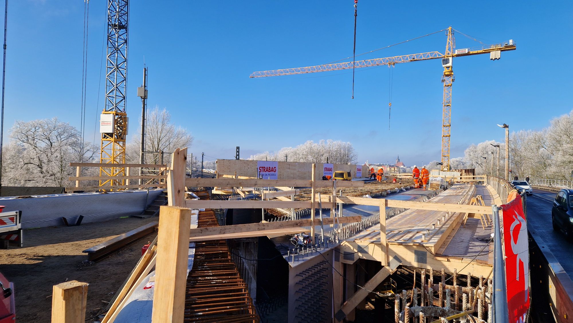 An der Schleusenbrücke in der Krakauer Straße gilt aufgrund des baulichen Zustands weiterhin eine Lasteinschränkung auf 12 Tonnen. Der schwere Verkehr wird weiträumig umgeleitet. Für 2026 sind umfangreiche weitere Untersuchungen vorgesehen, darunter die Entnahme und Prüfung von Spanndrähten, Untersuchungen an Beton, Bewehrung und Verpressmörtel, eine detaillierte Risskartierung mit Monitoring sowie die Vorbereitung einer akustischen Überwachung. Ob weitere Nutzungseinschränkungen erforderlich werden, ist derzeit offen. Parallel werden die Gespräche über eine Übernahme der Baulast durch die Wasserstraßen- und Schifffahrtsverwaltung fortgeführt.