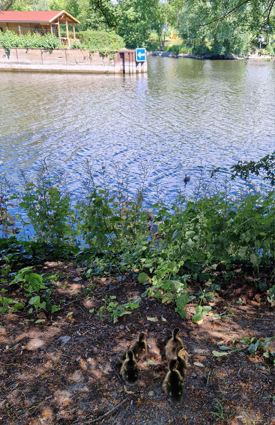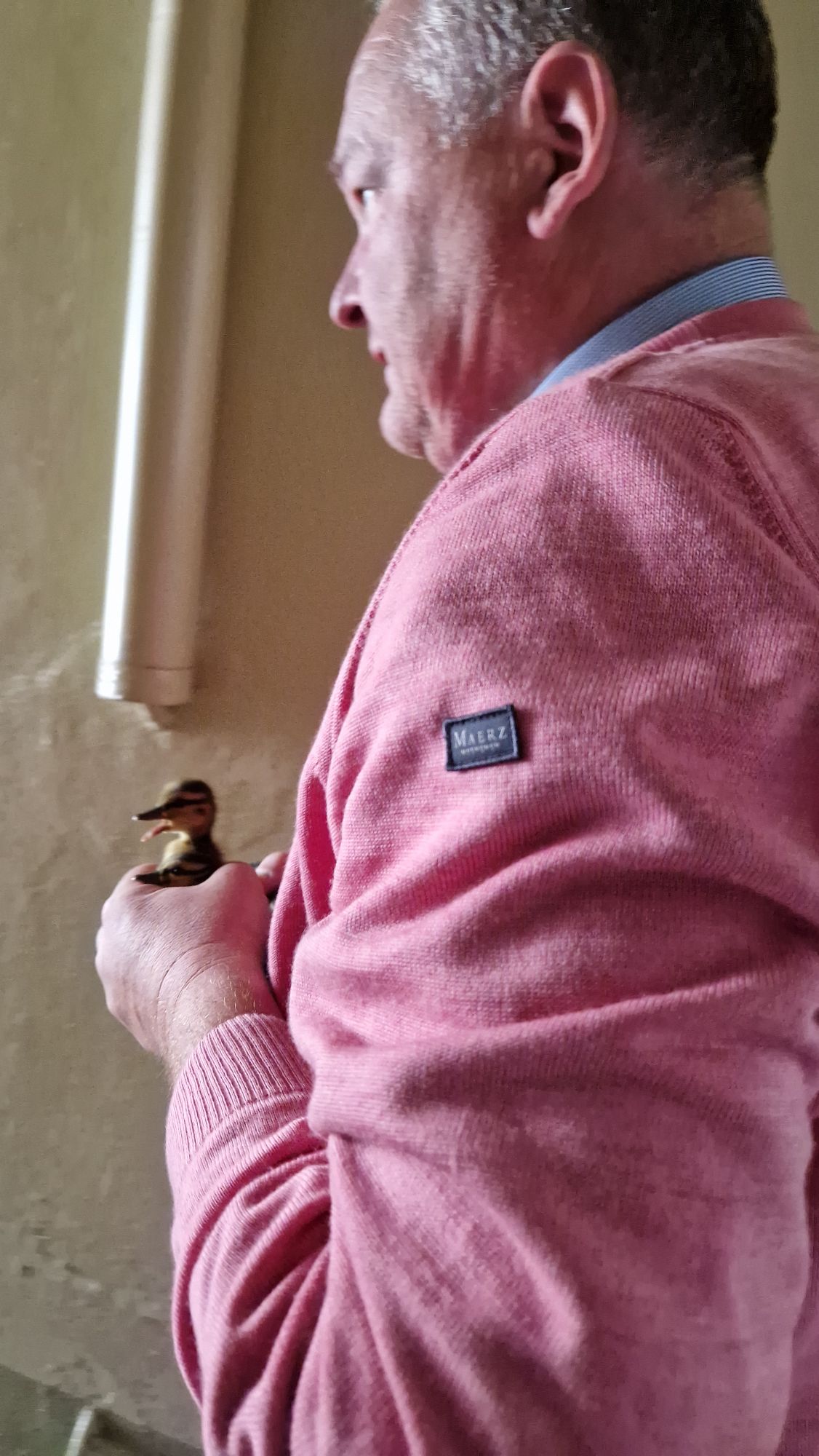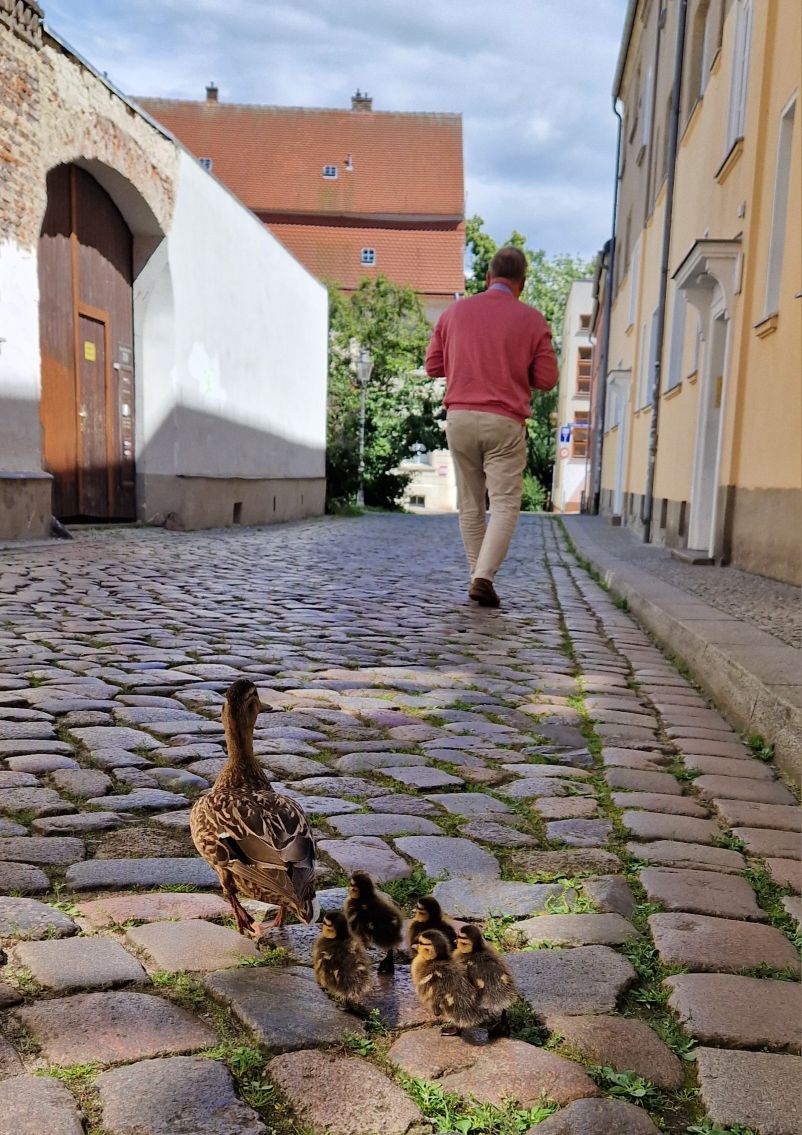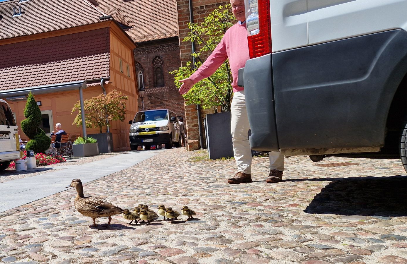 Eine Stockentenfamilie watschelte Mittwochnachmittag aufgeregt über das Kopfsteinpflaster zwischen parkenden Autos auf dem Hof des Rathauses der Altstadt. Weit weg vom Wasser. Ihr lautes Schnattern war nicht zu überhören, weswegen Rechtsamtsleiter Florian Schmidt aus seinem Fenster im Erdgeschoss das rege Treiben kurz beobachtete und als Tierkenner und -freund zur Tat schritt. Mit Kollege Thomas Messerschmidt hielt er die Entenfamilie, die sich ein großes Gebüsch für den Nestbau auserkoren hatte, zusammen und steuerte sie in Richtung Grundstück von Bäcker Norbert Rettig, der mit seinem Transporter soeben in die Garage wollte. Die verbindet auf kürzestem Weg den Rathaushof mit der Bäckerstraße, die über die Altstädtische Wassertorstraße schnellstens zum Wasser führt. Zwei Ausreißer der frisch geschlüpften Küken konnte Florian Schmidt vorsichtig aufnehmen, weswegen der Rest der Familie noch leichter folgte. Zusammen mit einigen Schaulustigen ging es ans Wasser, wo die Entenfamilie glücklich vereint gen Neustadt schwamm.