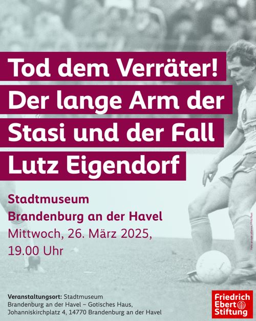 Diese Veranstaltung möchte anhand der Biografie des aus Brandenburg an der Havel stammenden Fußballers Lutz Eigendorf an das historische Kapitel von Flucht und Repression in der SED-Diktatur erinnern.