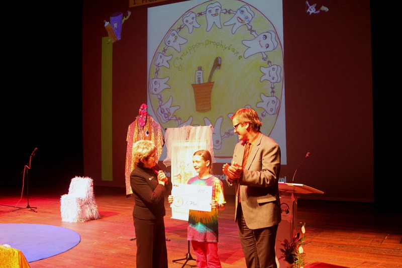 Rebecca Ricker aus der Evangelischen Grundschule in Brandenburg an der Havel hat den Entwurf für das Logo der Brandenburger Gruppenprophylaxe gestaltet. Sie kann aus den Händen von Staatssekretär Dr. Daniel Rühmkorf den 1. Preis – einen Scheck über 400 Euro für die Klassenkasse – in Empfang nehmen. Die weiteren Preisträger – sie erhalten jeweils 300 Euro für die Klassenkasse – kamen aus der Grundschule Prösen (Elbe-Elster) und der Grundschule „Am Waldrand“ Schwedt/Oder (Uckermark). Der Sonderpreis, ein Klassensatz elektrischer Zahnbürsten, geht an die Schüler des Paulus-Praetorius-Gymnasiums (Barnim).