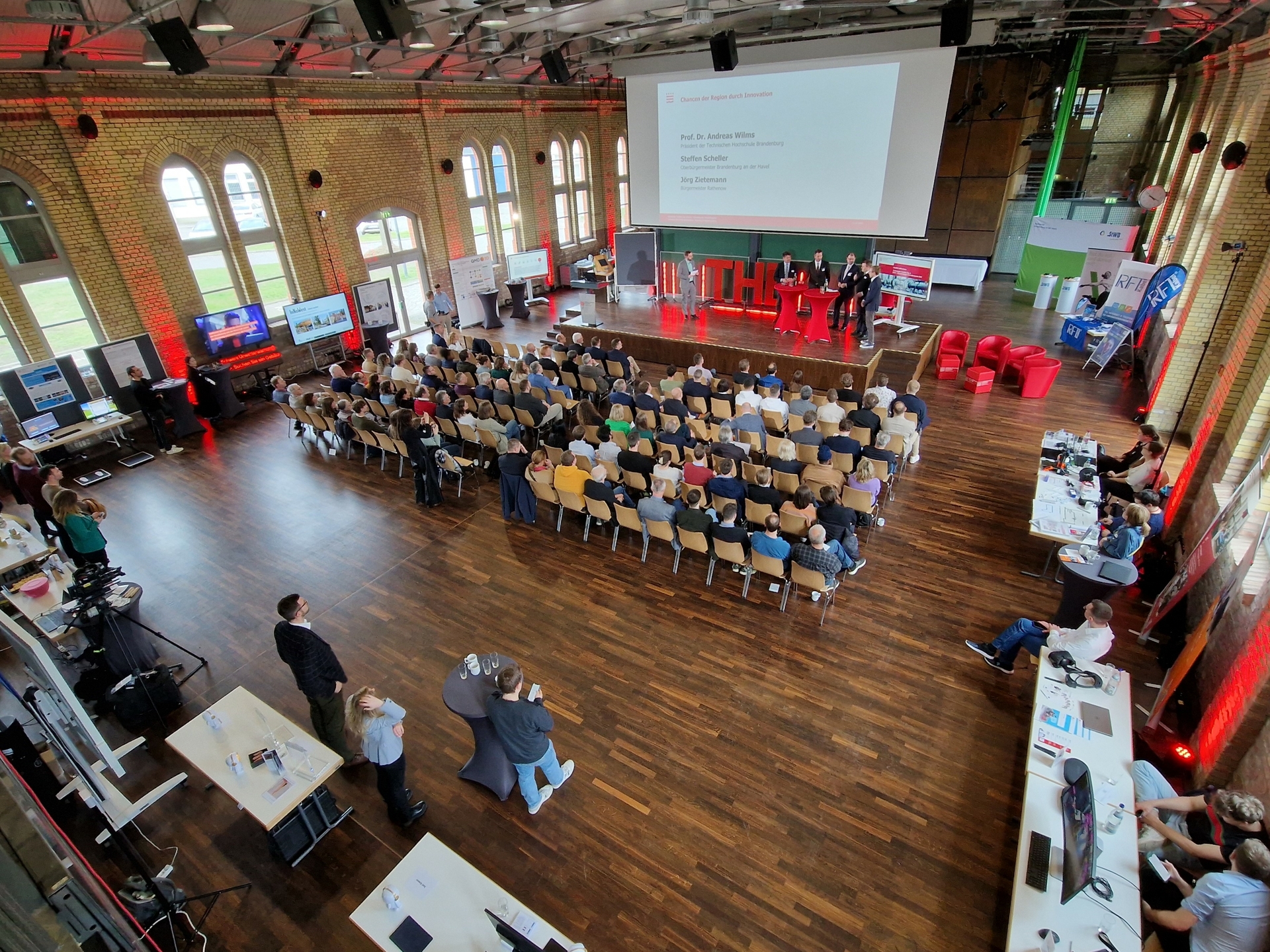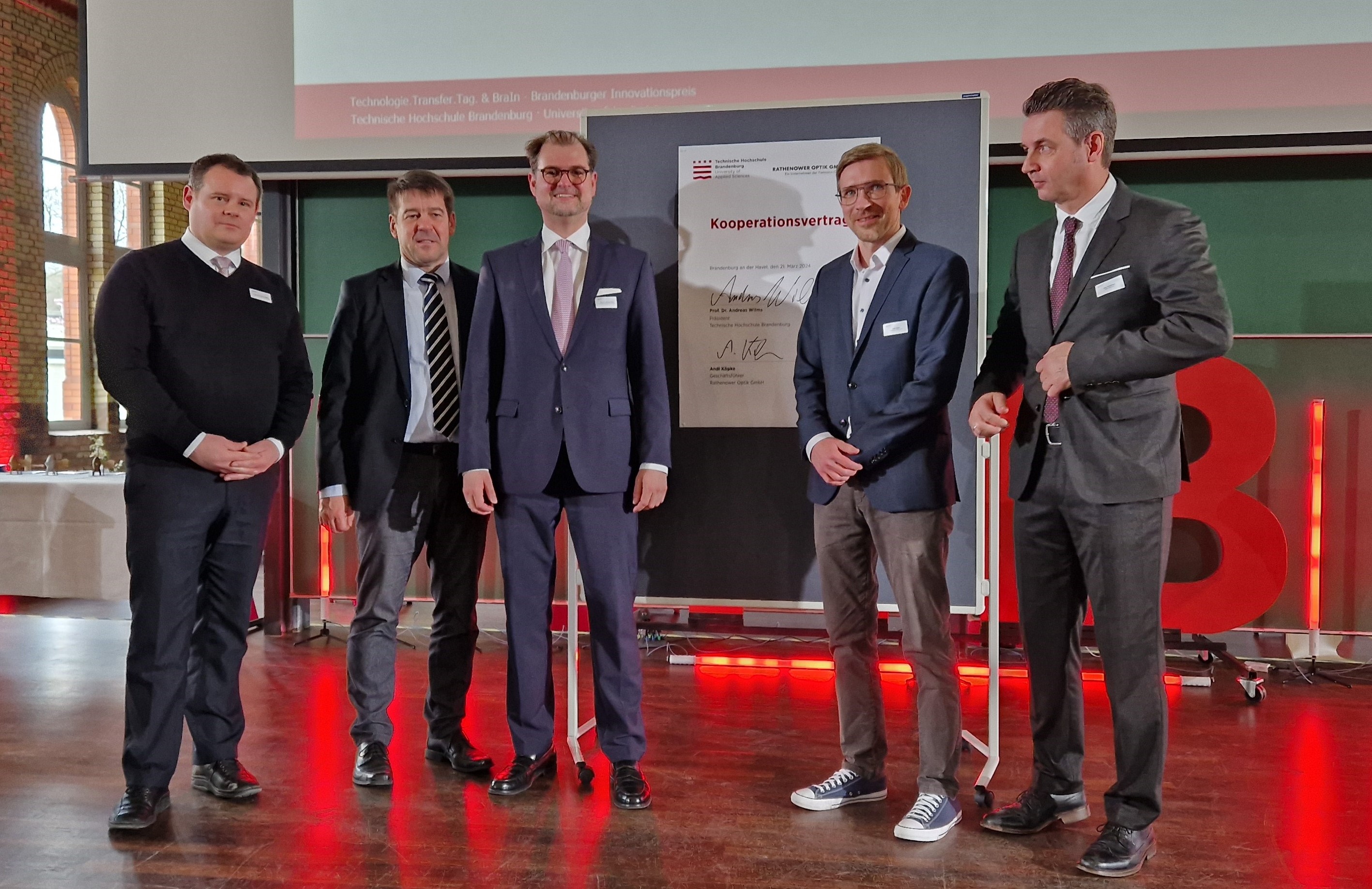 sagt THB-Präsident Prof. Dr. Andreas Wilms. Gemeinsam mit dem Brandenburger Oberbürgermeister Steffen Scheller und dem Rathenower Bürgermeister Jörg Zietemann sprach er auf der Bühne des Audimax über lokale Kooperationen und Chancen für die Region durch Innovationen. Passend dazu unterzeichnete die THB an diesem Tag eine neue Kooperationsvereinbarung mit der Rathenower Optik GmbH.