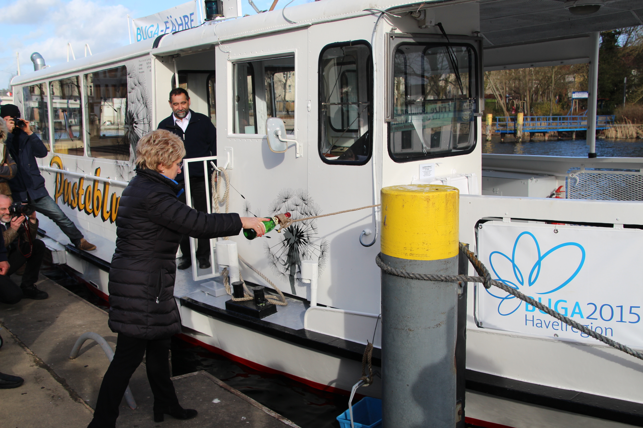 In Brandenburg an der Havel haben heute, 01.04.2015, drei von vier Schiffen der Brandenburger Unternehmer Kerstin und Lothar Bischoff neue Namen bekommen. Die Schiffe werden ab 18.04.2015 als BUGA-Fähren in der Stadt Brandenburg an der Havel eingesetzt. Sie heißen Pusteblume, Klatschmohn und Fleißiges Lieschen. Dazu gesellt sich die Frieda – sie hatte bereits ihren Namen. Die offizielle der Schiffe Taufe wurde von der Vorsteherin des BUGA-Zweckverbandes Dr. Dietlind Tiemann im Beisein von Erhard Skupch, Geschäftsführer des BUGA-Zweckverbandes, und den Inhabern der Schiffe Kerstin und Lothar Bischoff, Reederei NORDSTERN, vorgenommen.