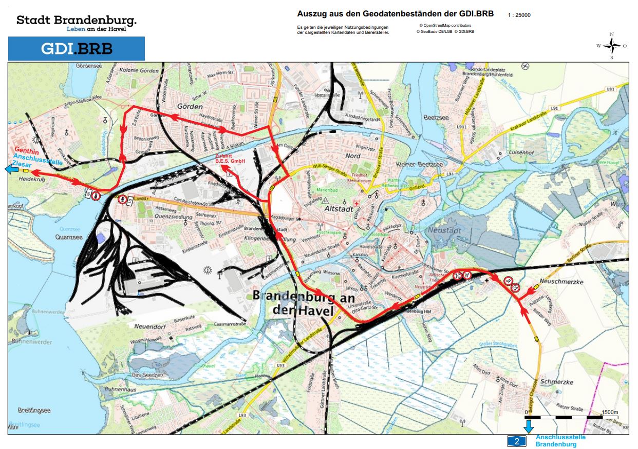Die Umleitung für Fahrzeuge ab einer zulässigen Gesamtmasse von 16 t erfolgt in beiden Richtungen über den Quenzweg, Gördenallee und die B102.