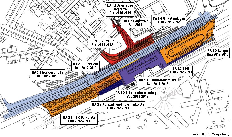 - 1. BA Bereich nördlich der Bundesstraße, ÖPNV-Anlagen und Bahnhofspassage (bereits im Bau)