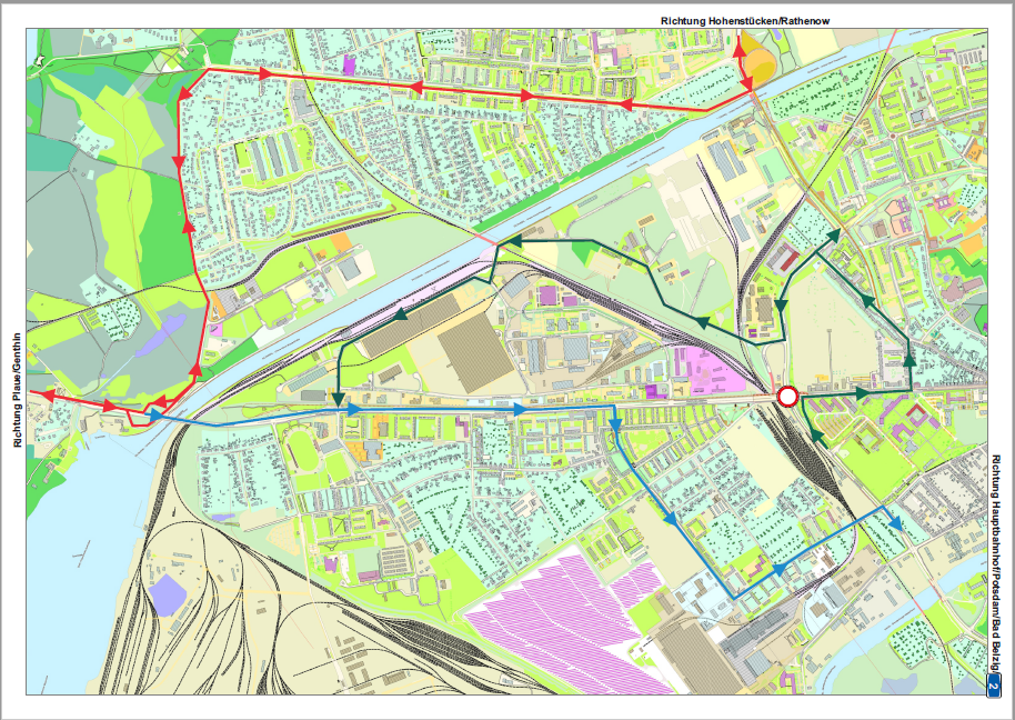 - Autofahrer aus Richtung Plaue/Genthin in Richtung Innenstadt bzw. Hauptbahnhof / Potsdam / Bad Belzig / Autobahn werden über die Magdeburger Landstraße, Friedrich – Engels-Straße und Klingenbergstraße zur B 102/ Zentrumsring geleitet.